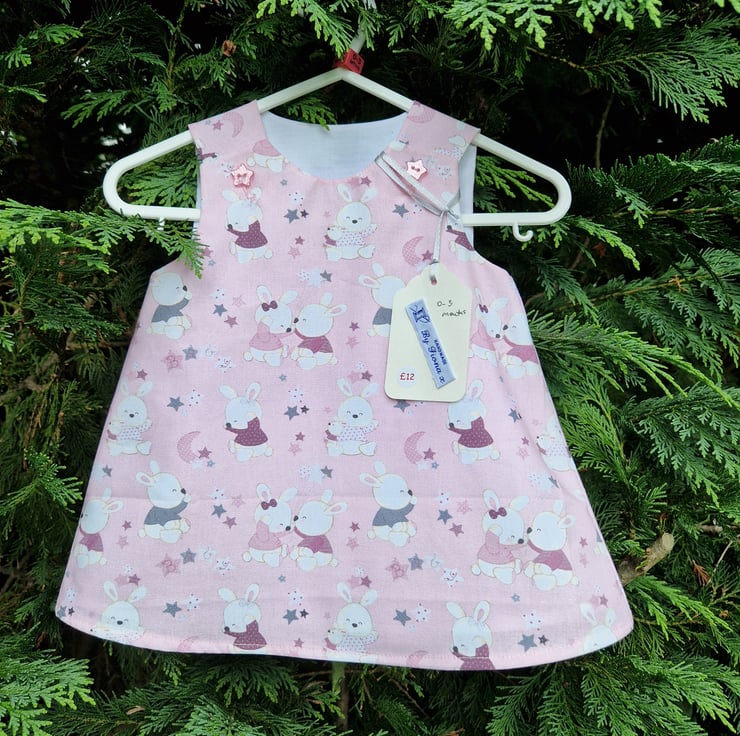 A fully lined A-line dress made from a pale pink cotton with a print of sitting bunnies with stars and moons and with plastic sparkly pink star shaped buttons. Can be worn with a long or short sleeve T shirt underneath and cardigan on top.