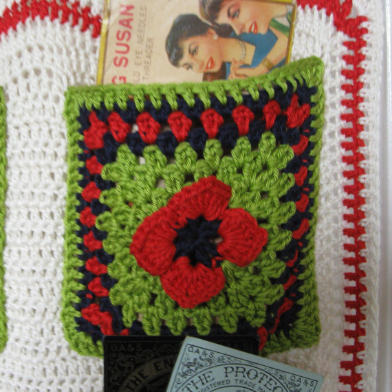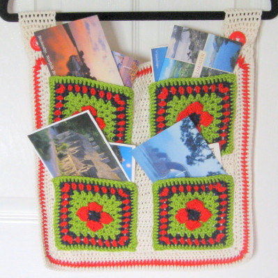 These crochet wall pockets are so cute. You can hang them up in almost any room in the house to take care of your small bits and pieces, such as letters, postcards, make up, toiletries. This one has been made in cotton double knitting but you could use a thicker yarn with a bigger hook. There are four pockets altogether which are stitched onto a backing which buttons onto a clothes hanger or a pole.. There are lots of photographs to help you and the pattern is very straightforward but you can always contact me with any questions.