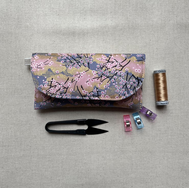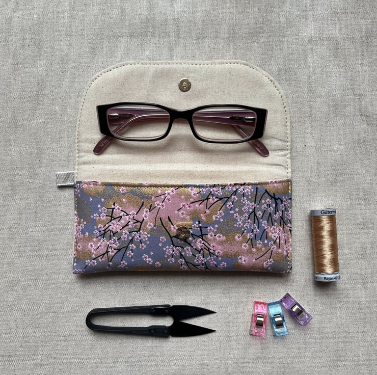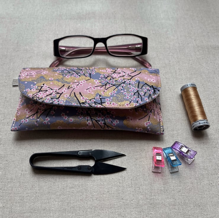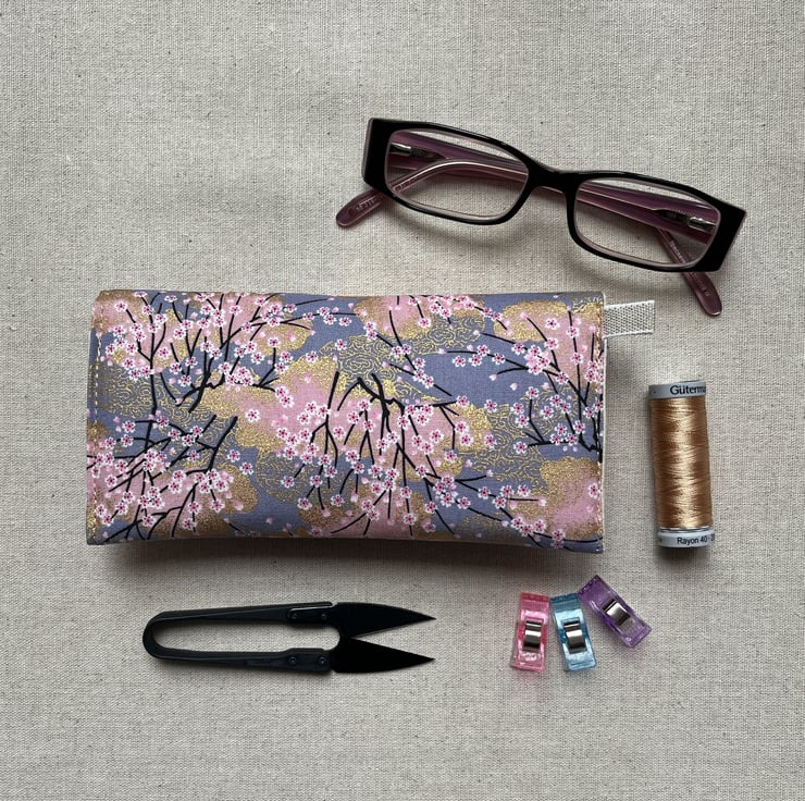 A soft padded glasses case handmade from timeless Japanese fabric illustrating tiny Japanese blossoms on a lilac and pink background with gold gilding.