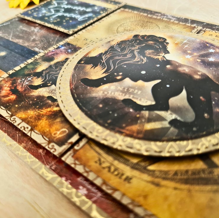 The card consists of mats & layers of gold foiled kraft card & luxury papers, all in zodiac theme. Coordinating toppers & panels create a unique layout. The sentiment "With Love To Someone Special" lays on the left top corner, followed by 2 celestial themed panels that accommodate the main topper with the Leo image. The card is embellished with pearls in Leo zodiac colour, orange. Finished with a coordinating insert that has been bordered with decorative photo corners & has been left blank, for you to add your own messages and wishes. It measures approx. 7" x 5" (18x13cm landscape). It comes with a white envelope to match the size of the card & is kept in a clear cellophane bag for protection. A small sticker with my shop details has been added at the back of the card.