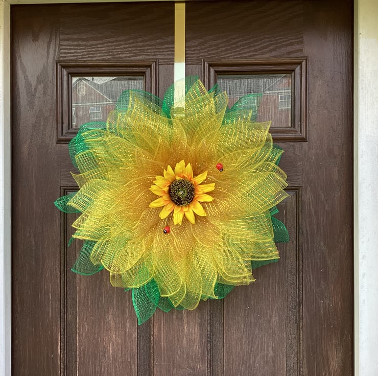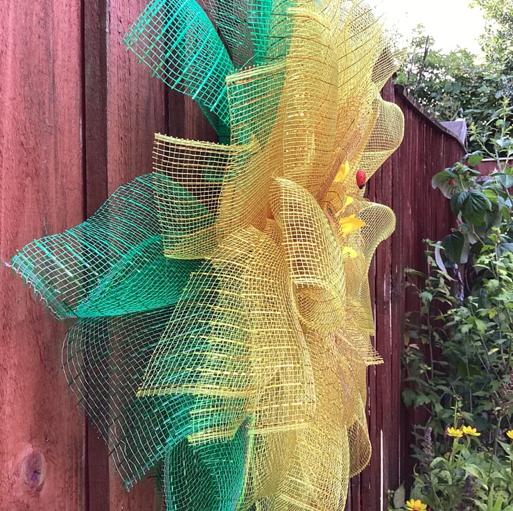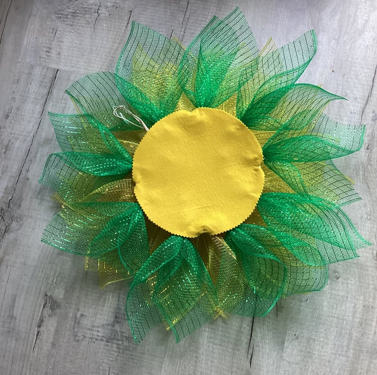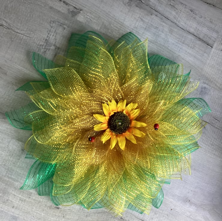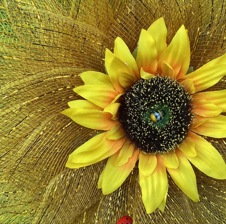 For this project I’ve used sparkly Metallic Deco mesh in gold, yellow and green colours. On the back I’ve used thick yellow felt , to protect wall or door. Sunflower in the middle , ladybirds and bee for decoration .