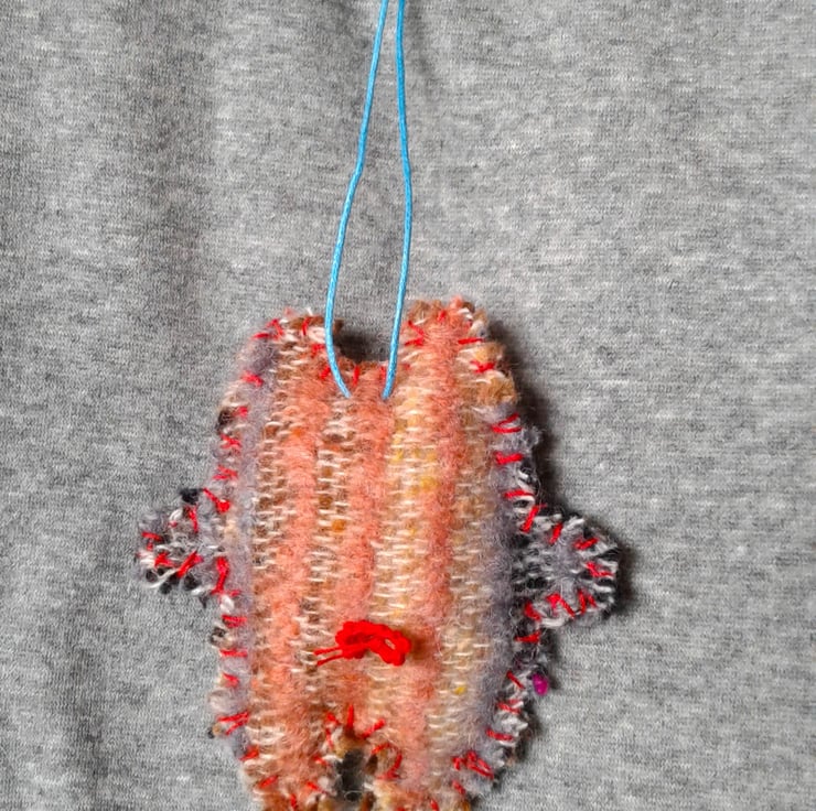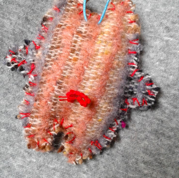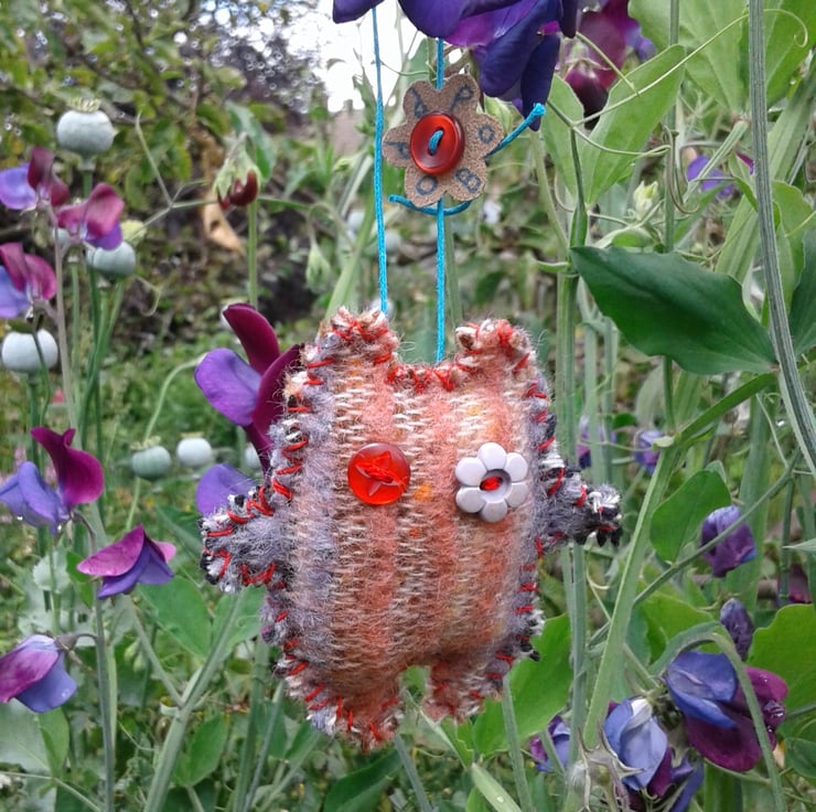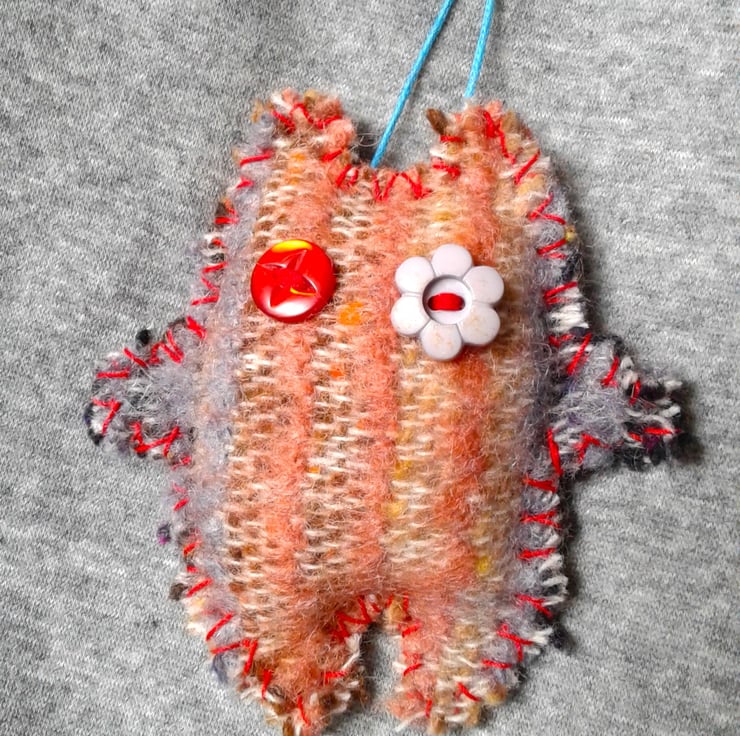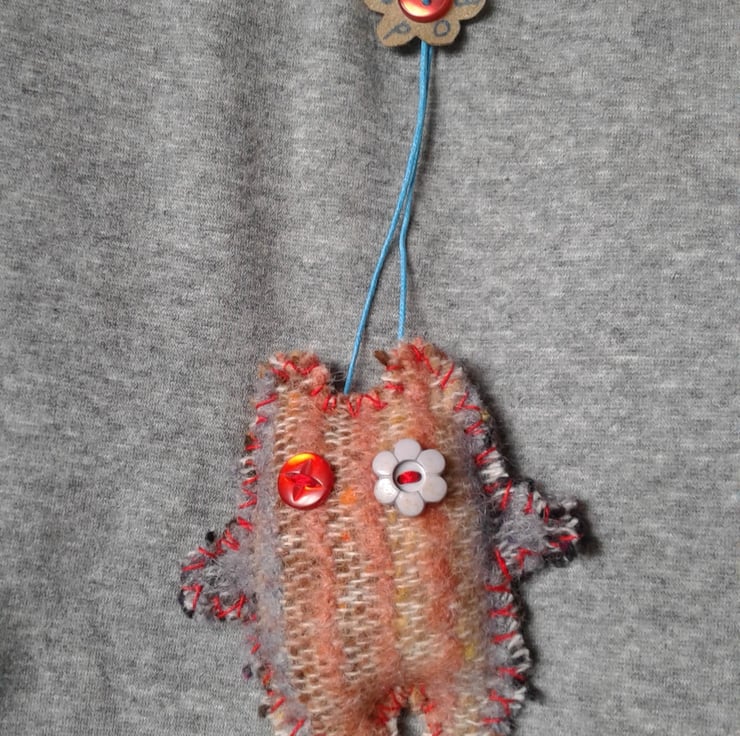 This little critter is made from left over woven wool tweed, too good to waste, hand stitched together and has buttons added for quirky features. Turn him round and he has a little tail. He hangs on a waxed cotton loop.