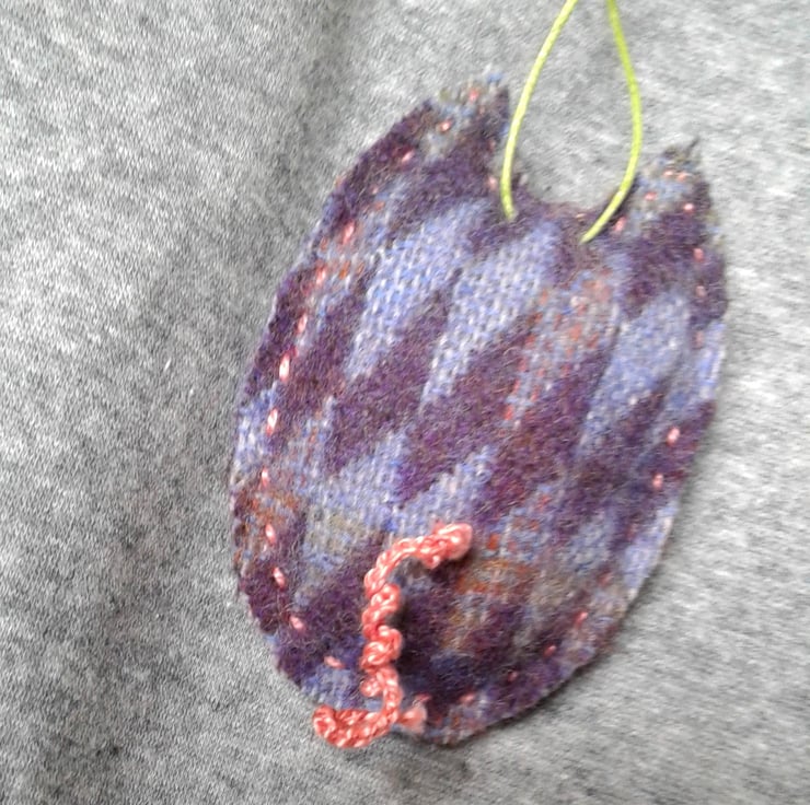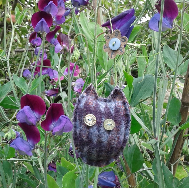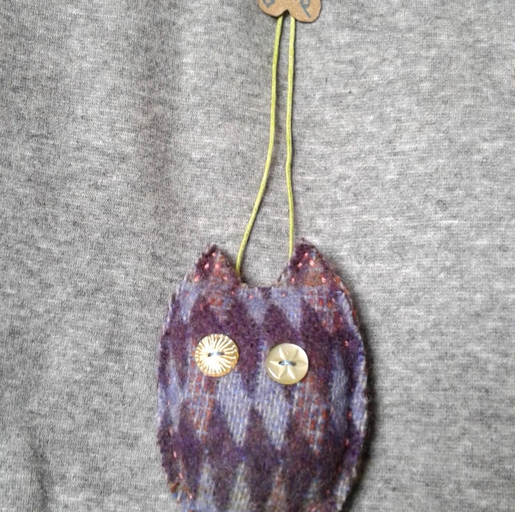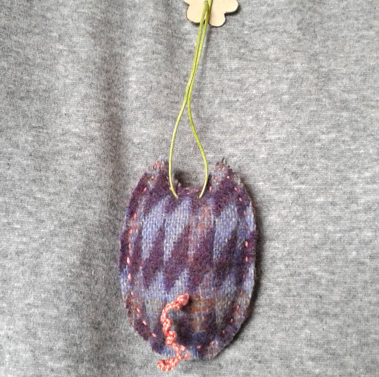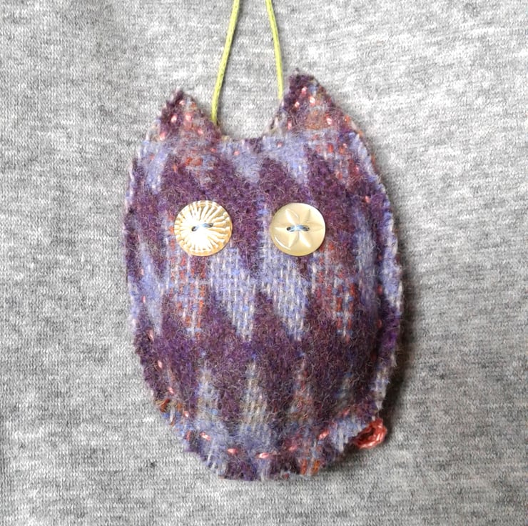 This little critter is made from left over woven wool tweed, too good to waste, hand stitched together and has buttons added for quirky features. Turn him round and he has a little tail. He hangs on a waxed cotton loop.