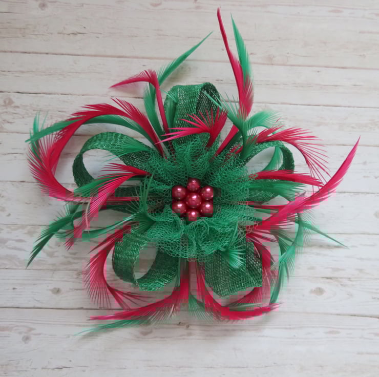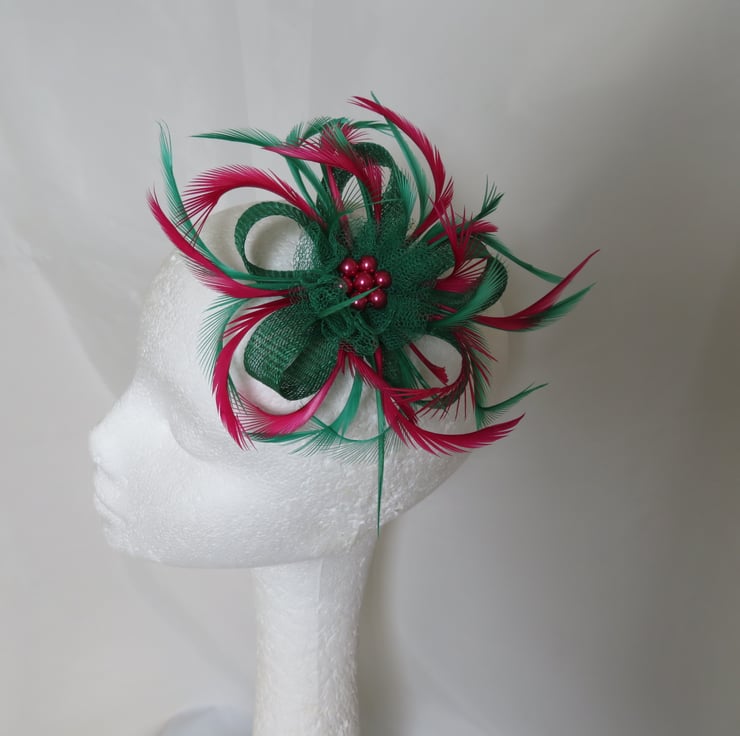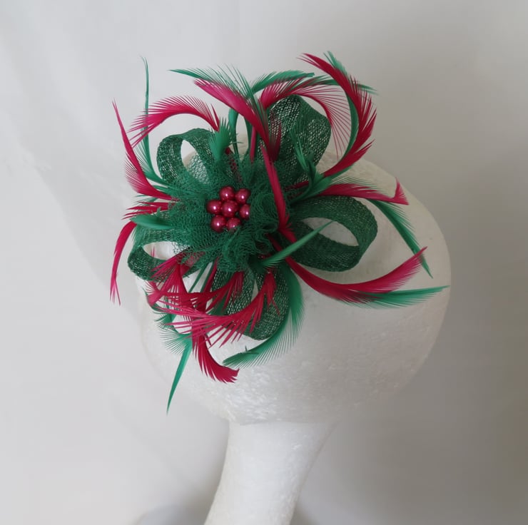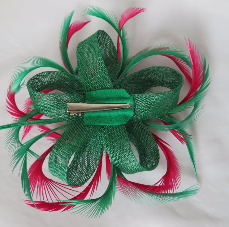 Emerald Green and Raspberry Pink Sinamay Loop Feather Clip Fascinator