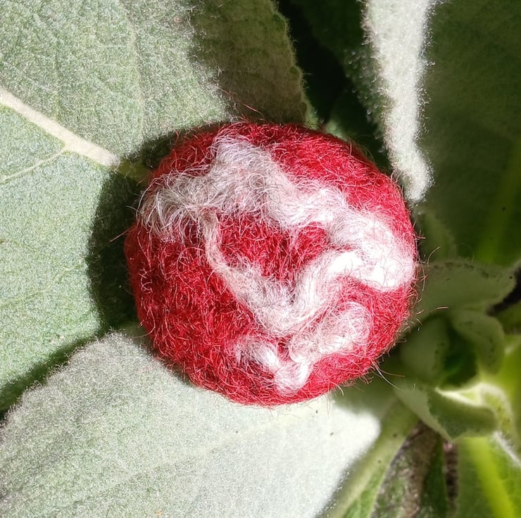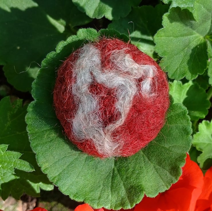A circular brooch made using hand-dyed and natural Gotland fleece.