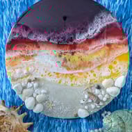 This textural piece is hugely tactile and is made with acrylic, eco friendly resin, white sand, white pebbles and stones, shells and dyed craft shells. I deliberately leave the sides of the piece alone after initial painting and allow the resin drips to remain. I feel that seeing the history of the painting's creation adds to the effect.