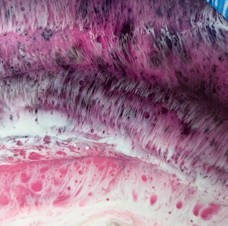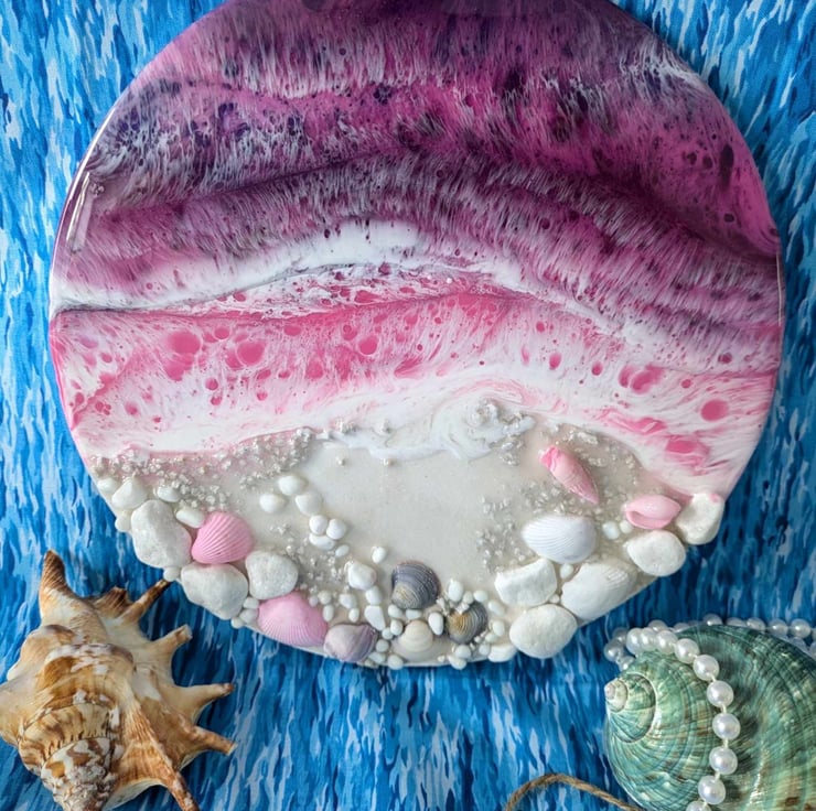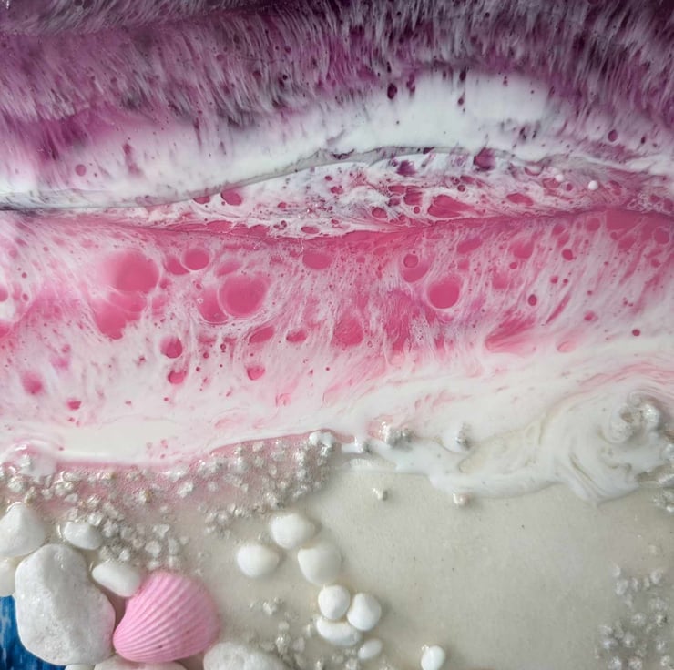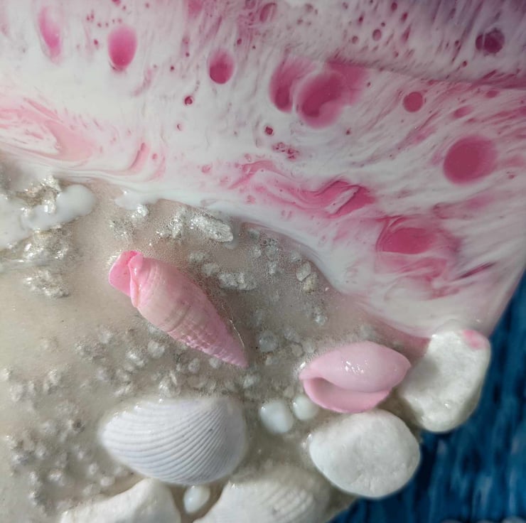 This textural piece is hugely tactile and is made with acrylic, eco friendly resin, white sand, white pebbles and stones, shells and dyed craft shells. I deliberately leave the sides of the piece alone after initial painting and allow the resin drips to remain. I feel that seeing the history of the painting's creation adds to the effect.