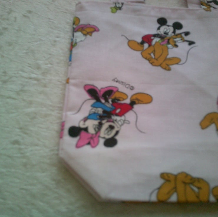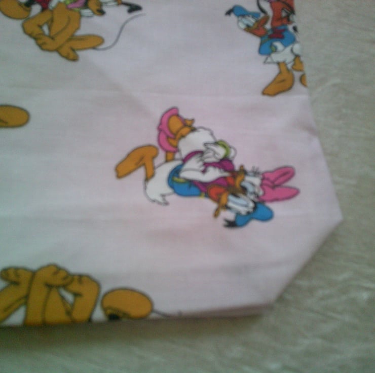 The fabric used has a design featuring Mickey Mouse, Minnie Mouse, Donald Duck and Goofy on a pale pink background.