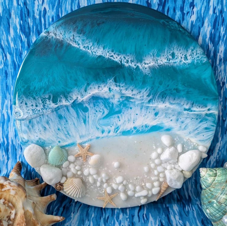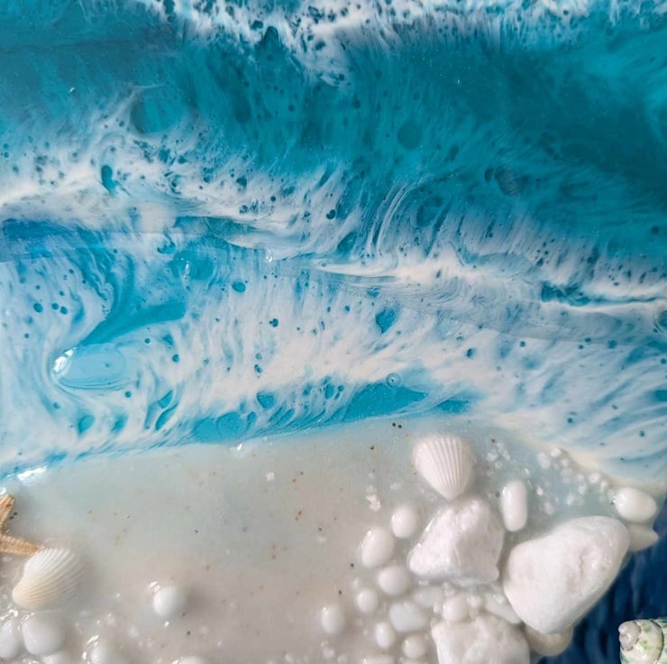 This textural piece is hugely tactile and is made with acrylic, eco friendly resin, white sand, white pebbles and stones, shells, a dyed craft shell and mini starfish. I deliberately leave the sides of the piece alone after initial painting and allow the resin drips to remain. I feel that seeing the history of the painting's creation adds to the effect.