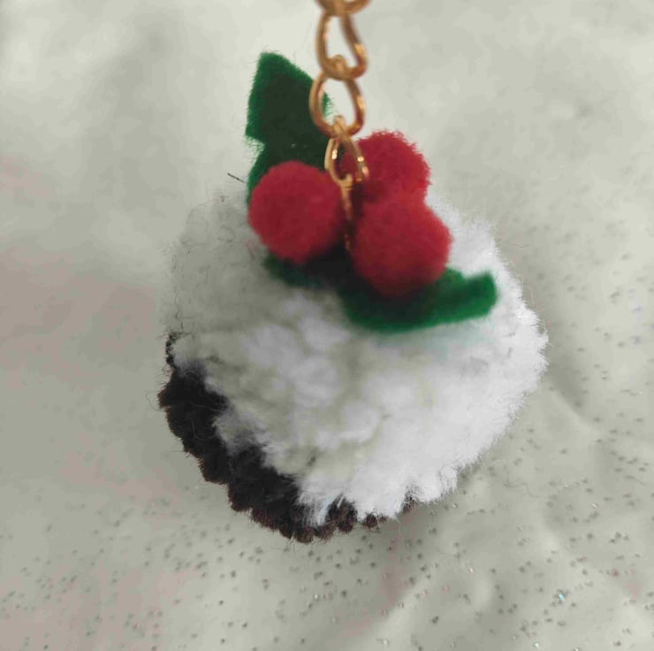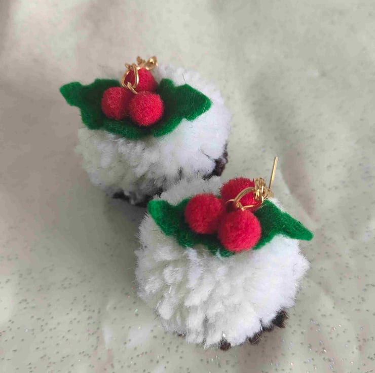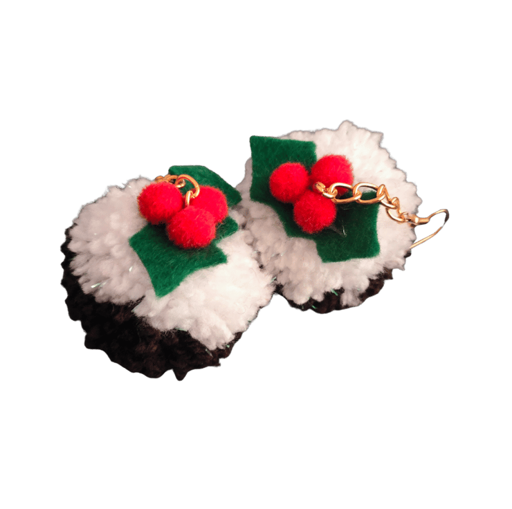 Handmade pom pom Christmas puddings made with brown and sparkly white wool attached to a gold coloured chain and a gold coloured ear wire