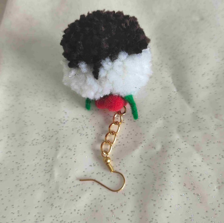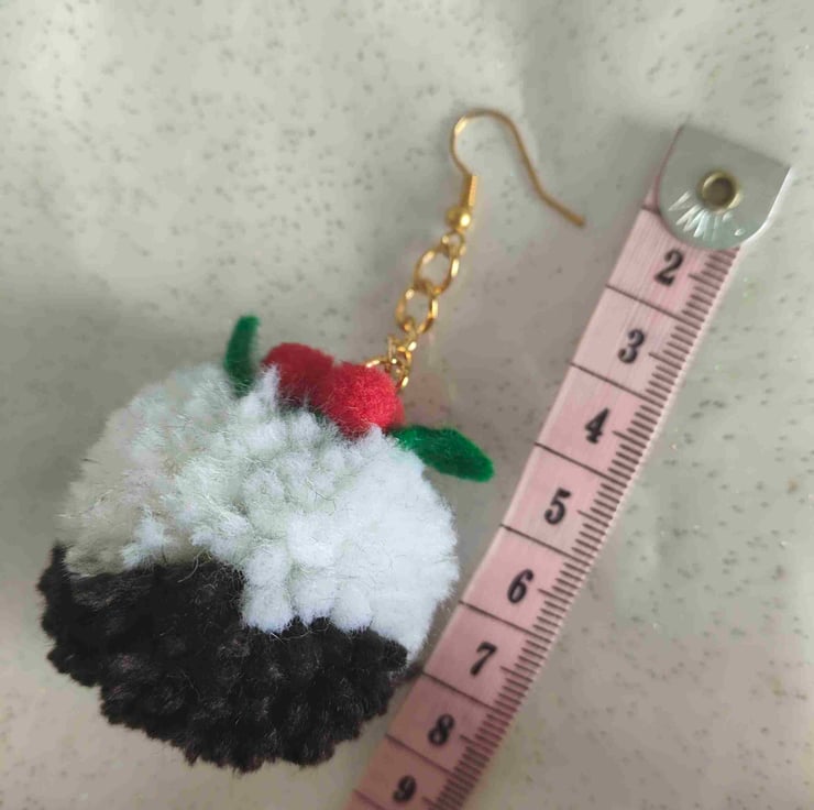 The pom pom pudding measures approximately 4cm across and the chain is approximately 3cm, 4cm including the gold coloured ear wire