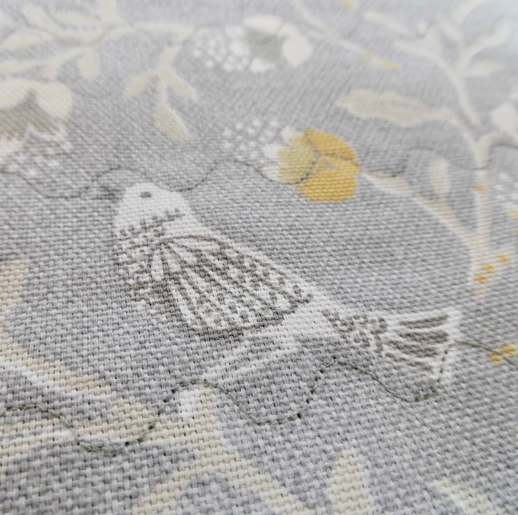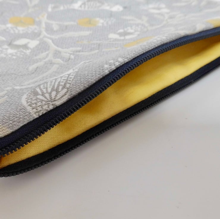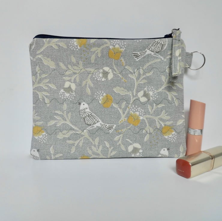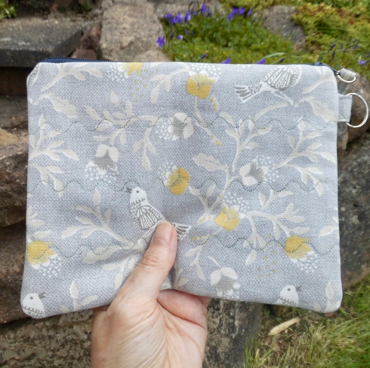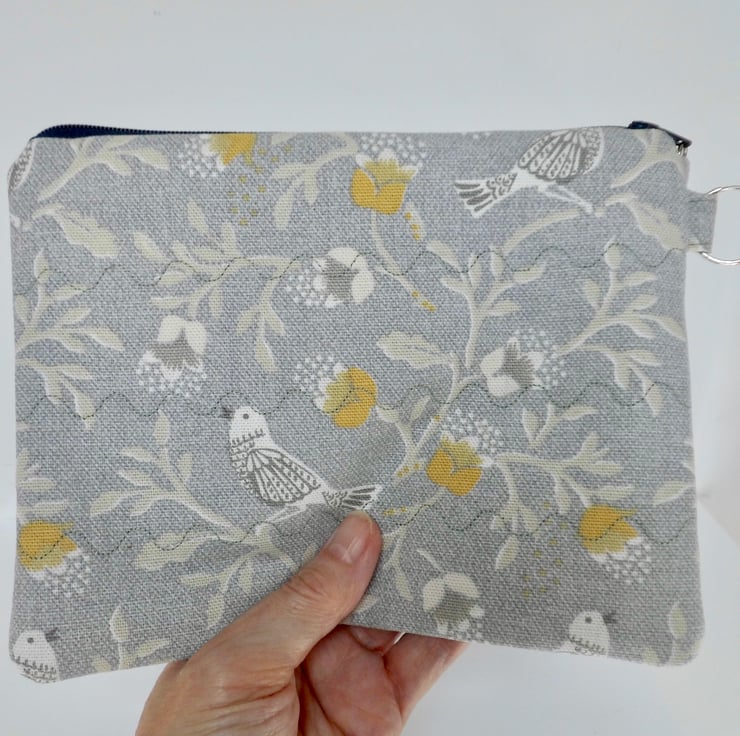 A soft-bodied zipped purse, made with a light grey furnishing weight fabric printed with little birds and yellow flowers. I backed this fabric with a layer of lightweight fleece by machine stitching it to the back each side with three rows of wave stitch. It has a bright yellow cotton lining.