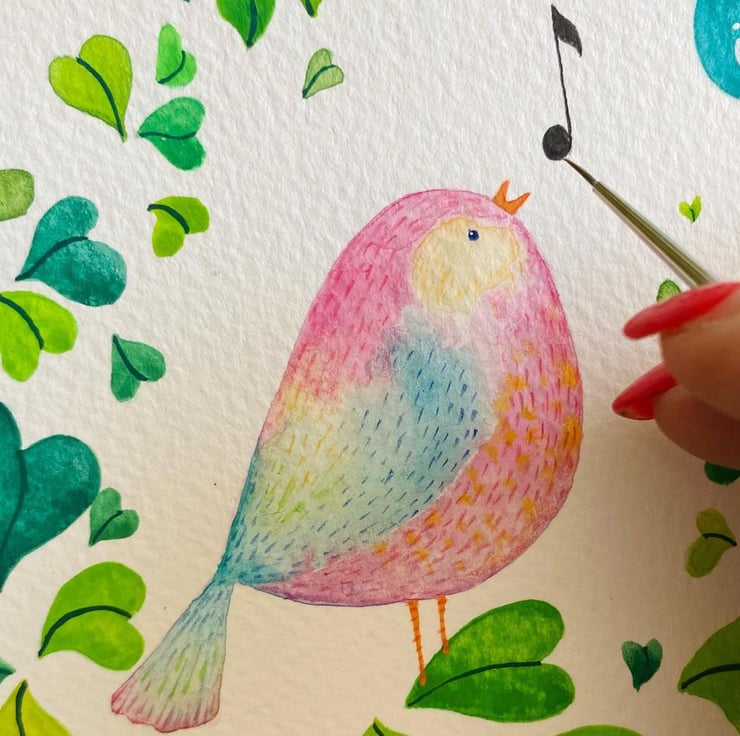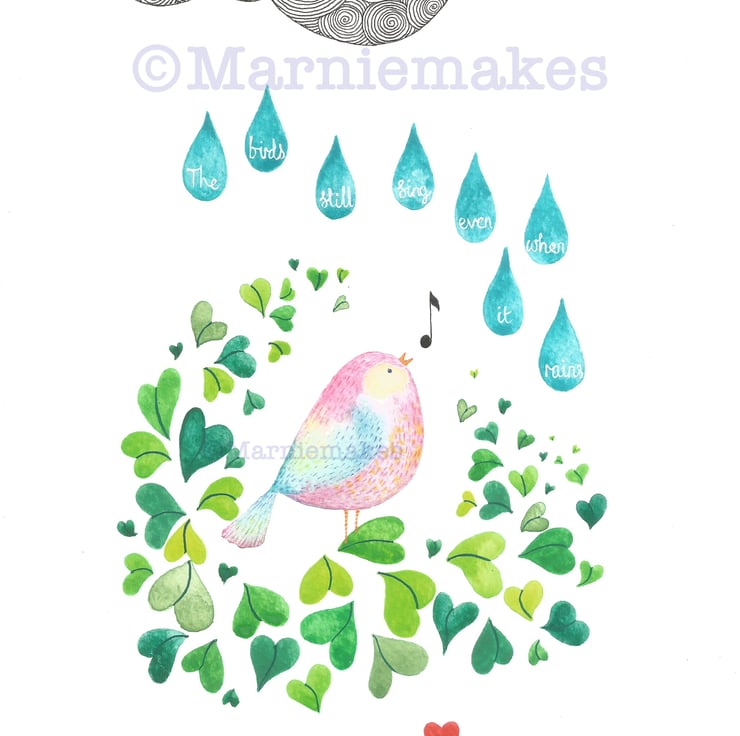 A soft, gentle, positive illustration on watercolour paper measuring 29.7 x 21cm (A4) using high quality gouache paints, and ink pen, featuring the words 'The Birds Still Sing, Even When It Rains''. Perfect as a gift and would look wonderful framed and mounted in an over sized mount and frame , making it even more of a feature in any room .