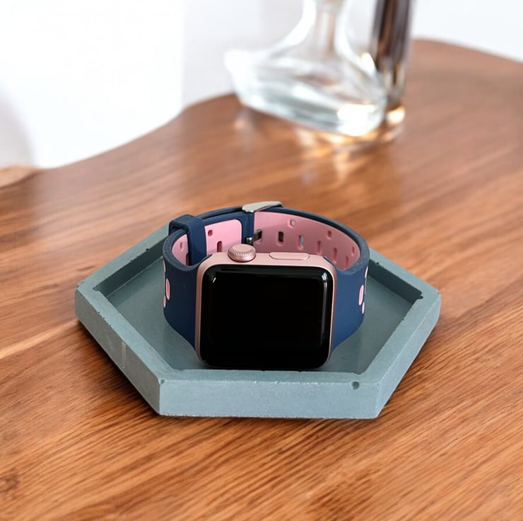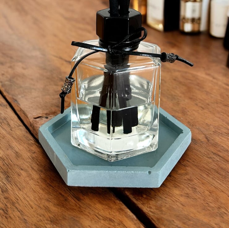 This grey concrete tray was designed and handcrafted by me in my small home studio in Standish. It features a hexagonal shape with a raised rim, making it perfect for storing and displaying various items. You can use it in your living room to hold a candle or diffuser, or on your dressing table to display jewellery, watches, or perfume. It can also serve as a holder for handwash or lotion in your bathroom, or as a tray for keys or loose change in your hallway.