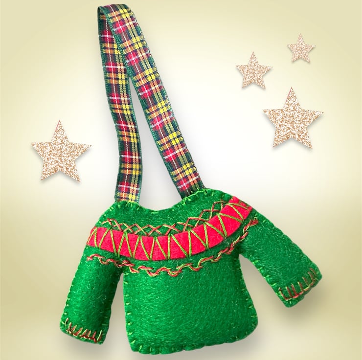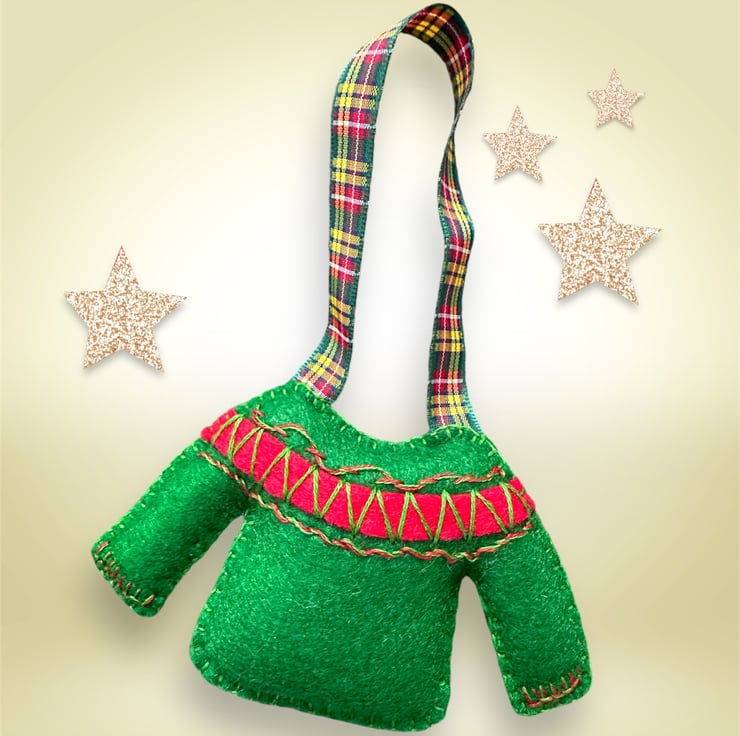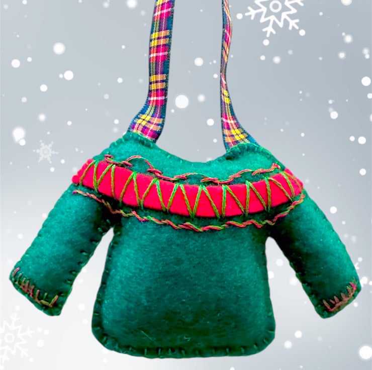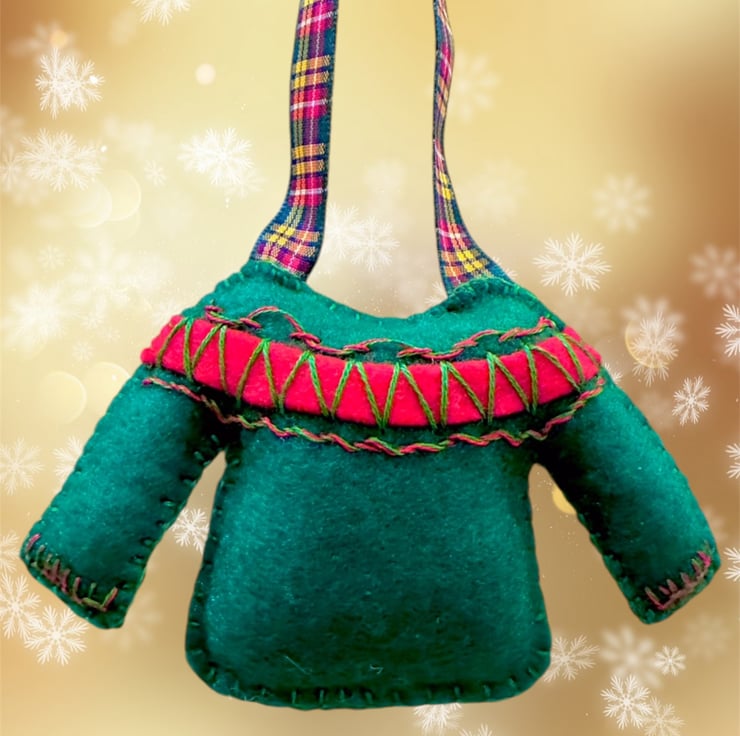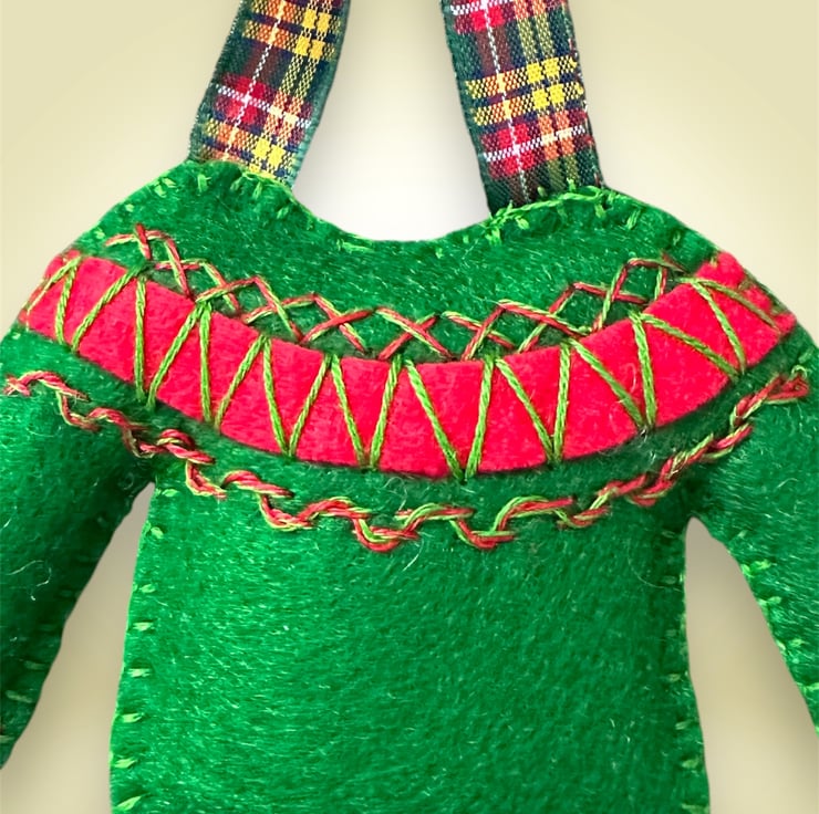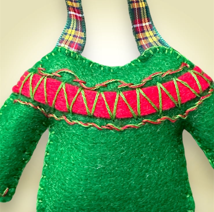 Hand cut and hand embroidered using Premium, high wool content (40%) felt and decorated with embroidery in 2 slightly different fairisle designs with matching tartan ribbons in complementary colours.