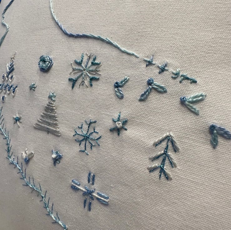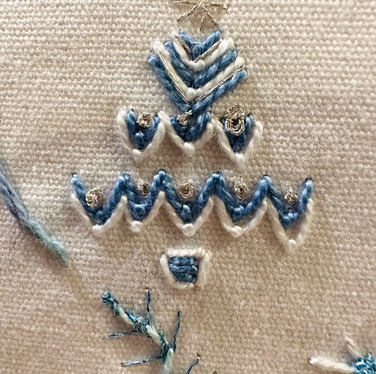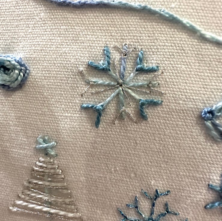 I’ve used DMC quality colourfast cotton Perle thread which has a subtle sheen and a subtle colour change for the main body. The trees, stars and snowflakes are in complementary colours of Perle threads and also metallic silver and blue threads for added sparkle.