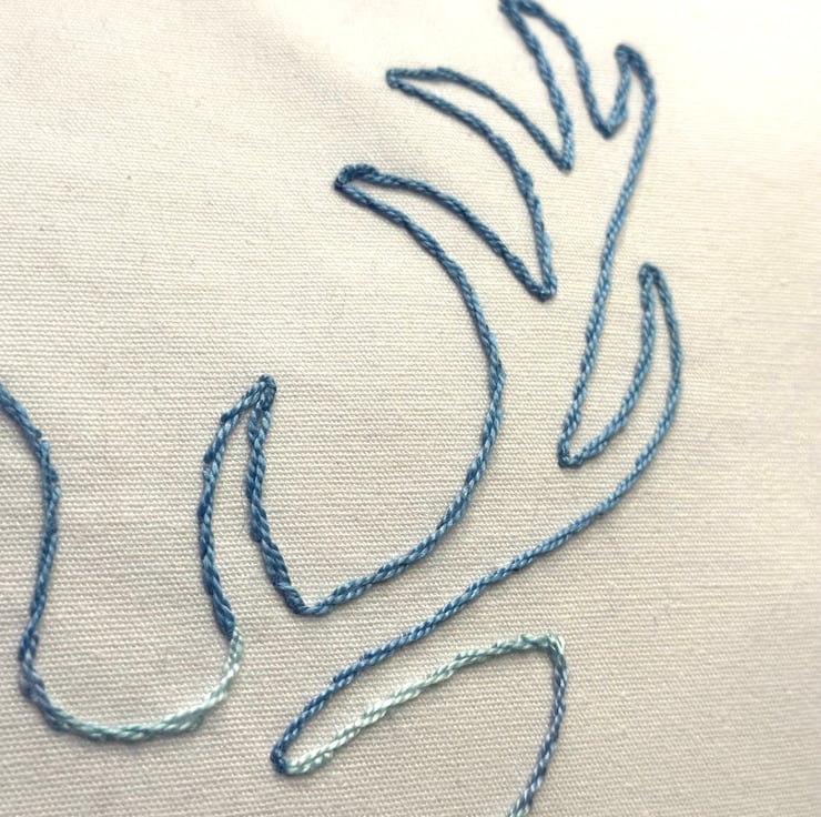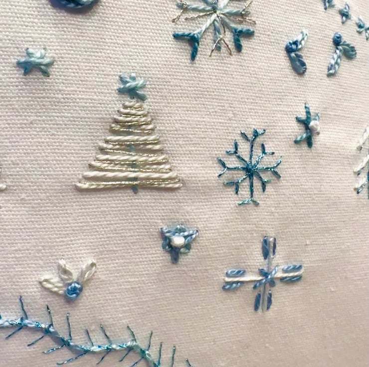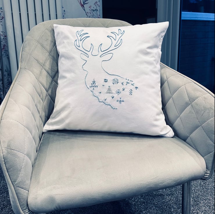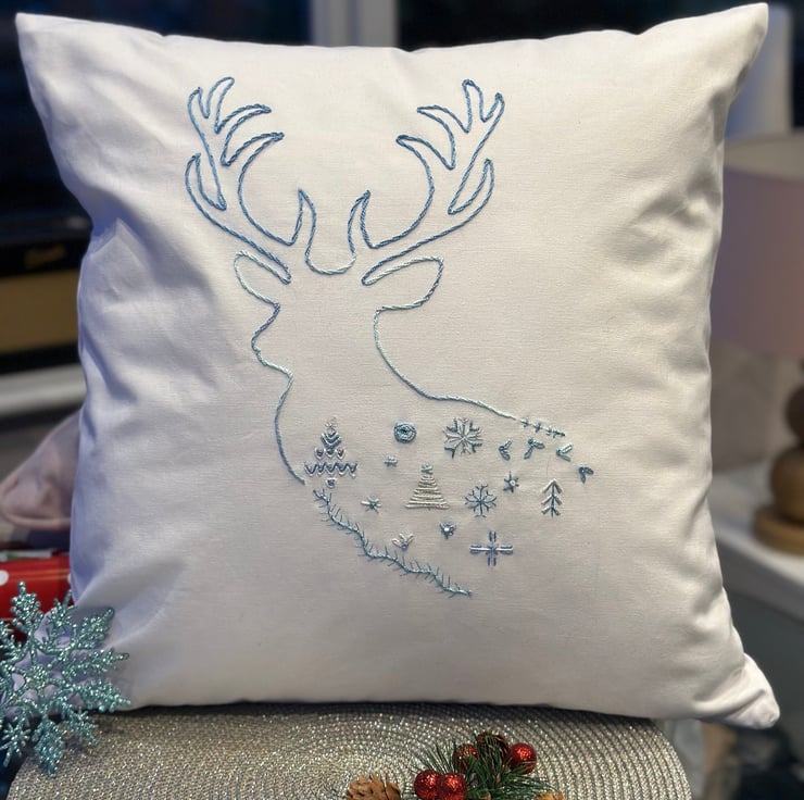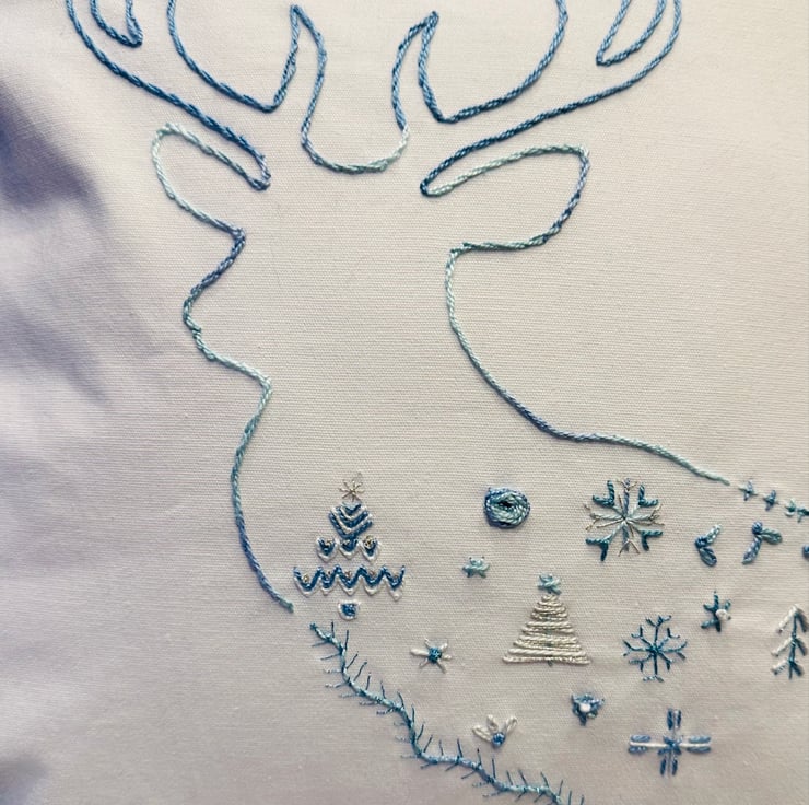 A large cushion cover which I’ve hand embroidered with an abstract reindeer cascading with Christmas sparkle- a host of different trees, stars, snowflakes and flowers in an alternative icy blue theme.