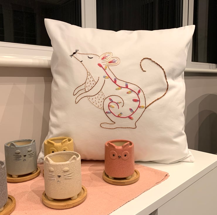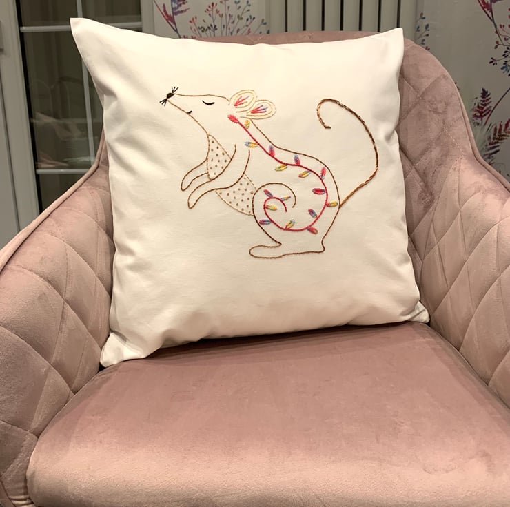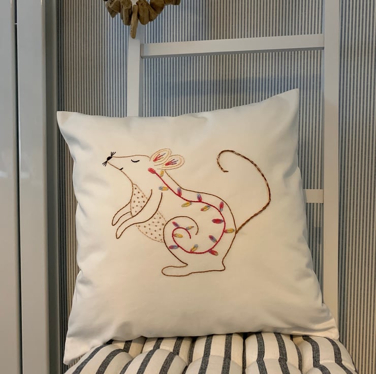 Large white cushion cover embroidered with a Multi coloured floral mouse design