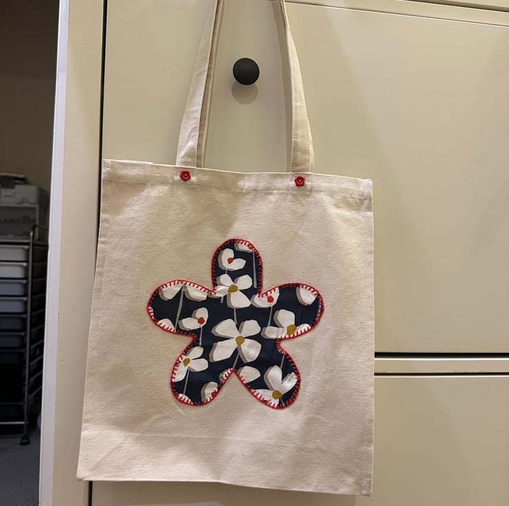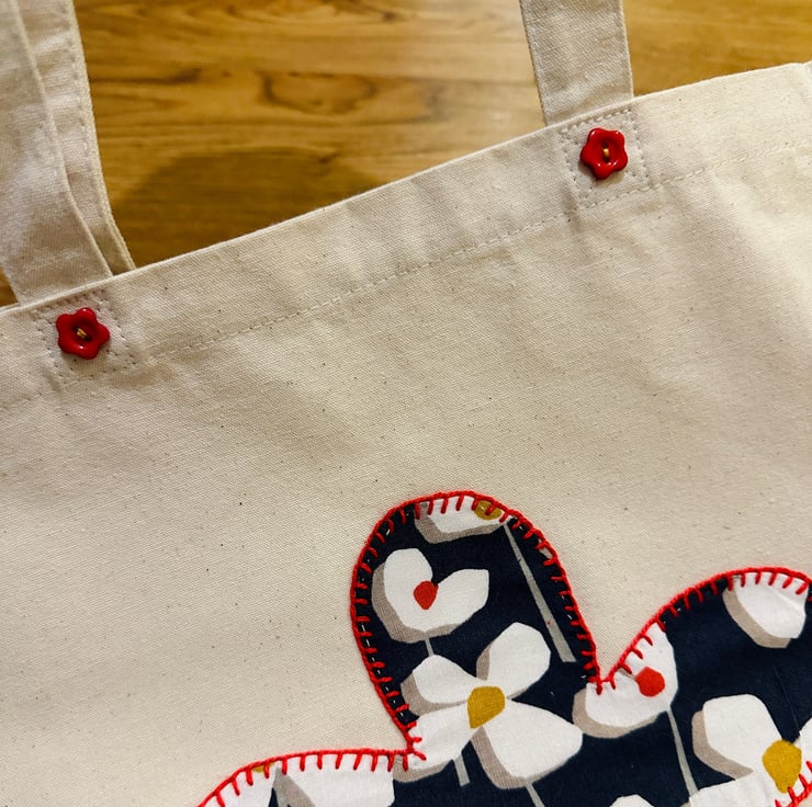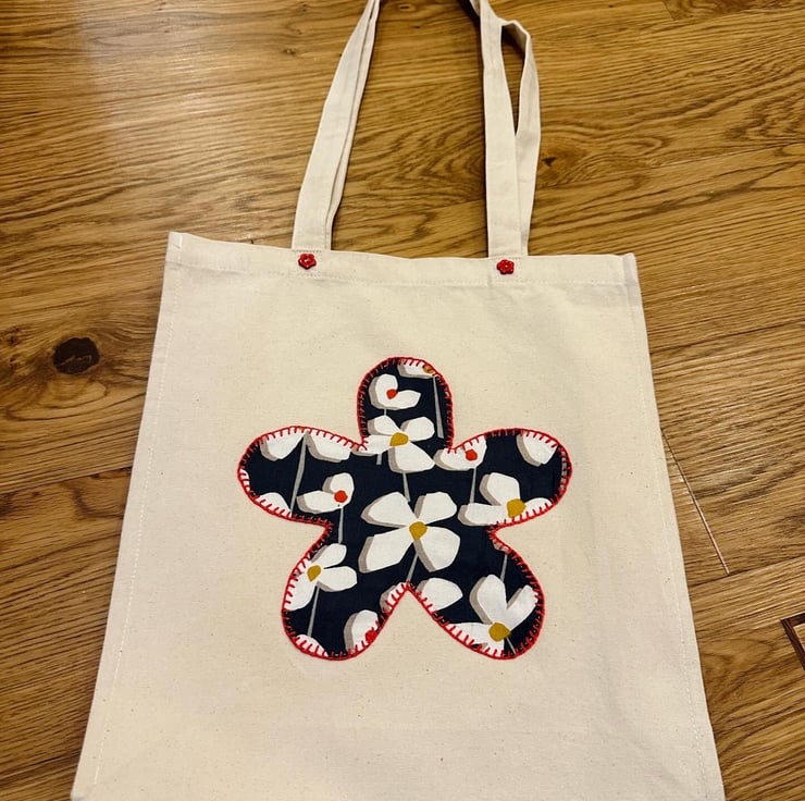 A unique striking tote bag with a floral design. I’ve hand drawn, cut and sewn an embroidered flower design and attached it to the tote using quality colourfast Perle cotton which has a lovely sheen. Flower buttons on the straps add a pretty finishing touch.