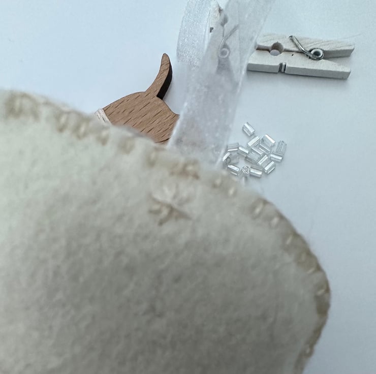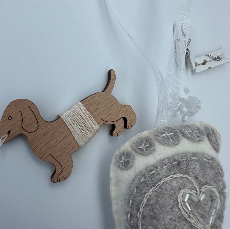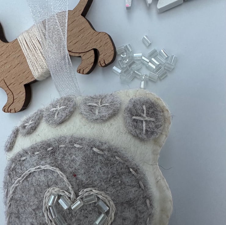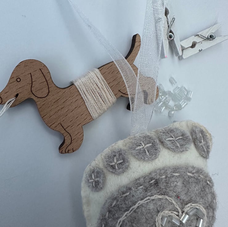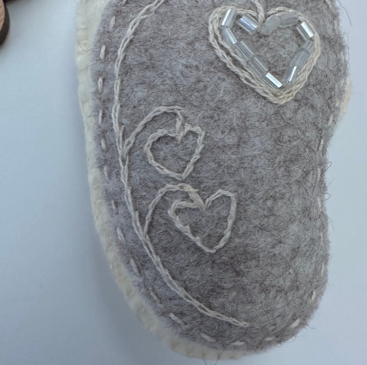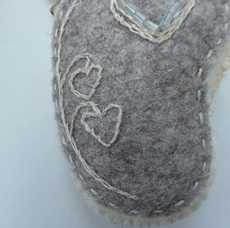 Made using the softest, quality, high (40%) wool content felt on the front and back, DMC cotton threads, glass seed beads with a pretty contrasting ribbon to hang it with.