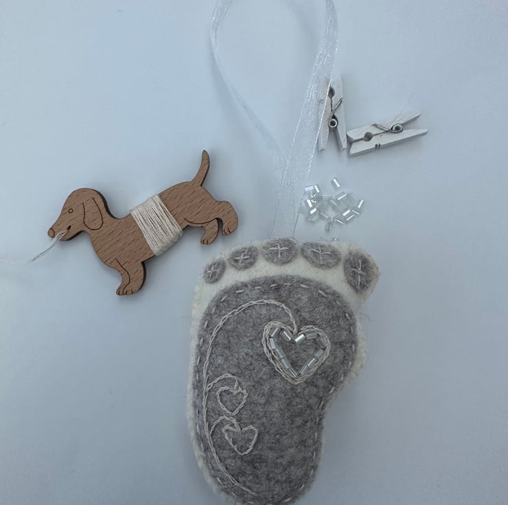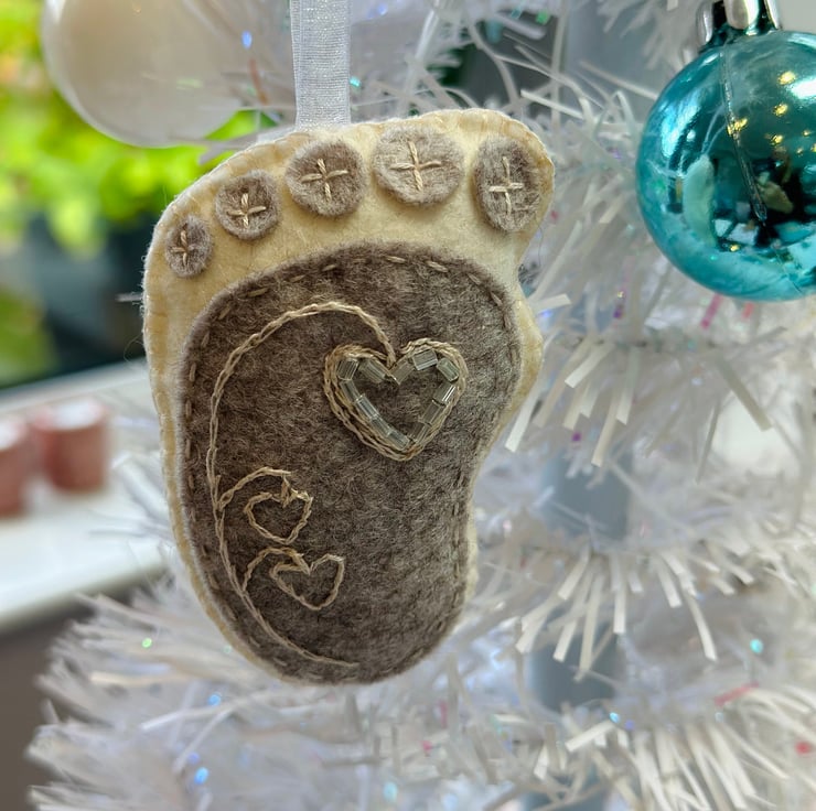 Lovingly hand cut and embroidered using the tiniest stitches, it is hand embroidered with DMC cotton threads and tiny glass seed beads on a grey heathered marl and cream footprint with tiny toes.