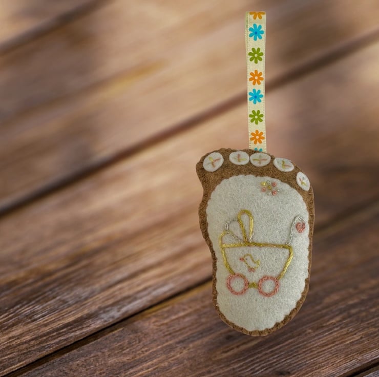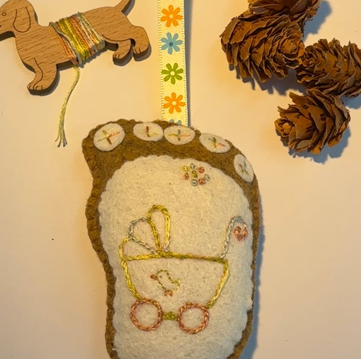 This one is featuring a sweet pram with a tiny bird in a colour changing thread and a pretty coordinating ribbon and could be the perfect gift to celebrate a new baby, a christening, baptism or look equally at home on the Christmas tree this year for baby’s first Christmas.
