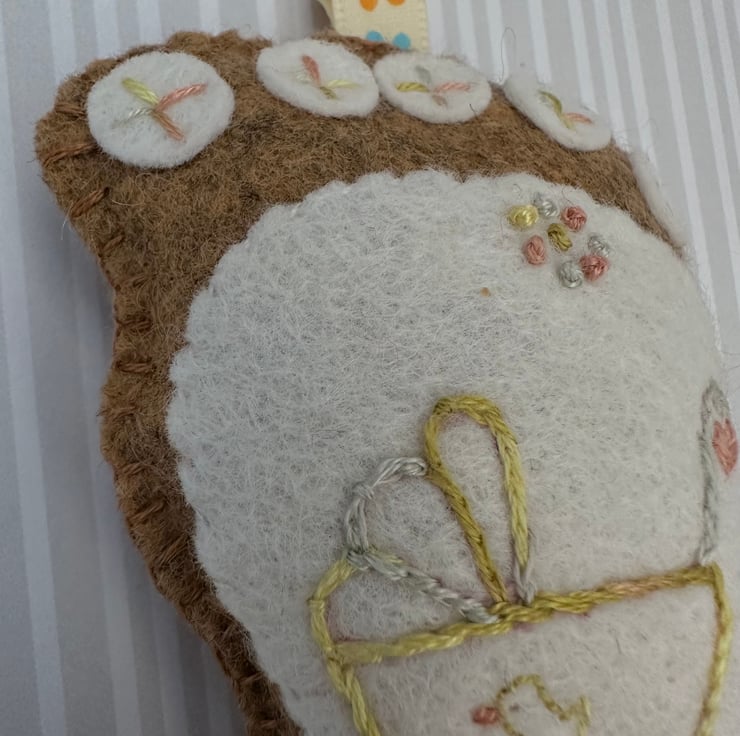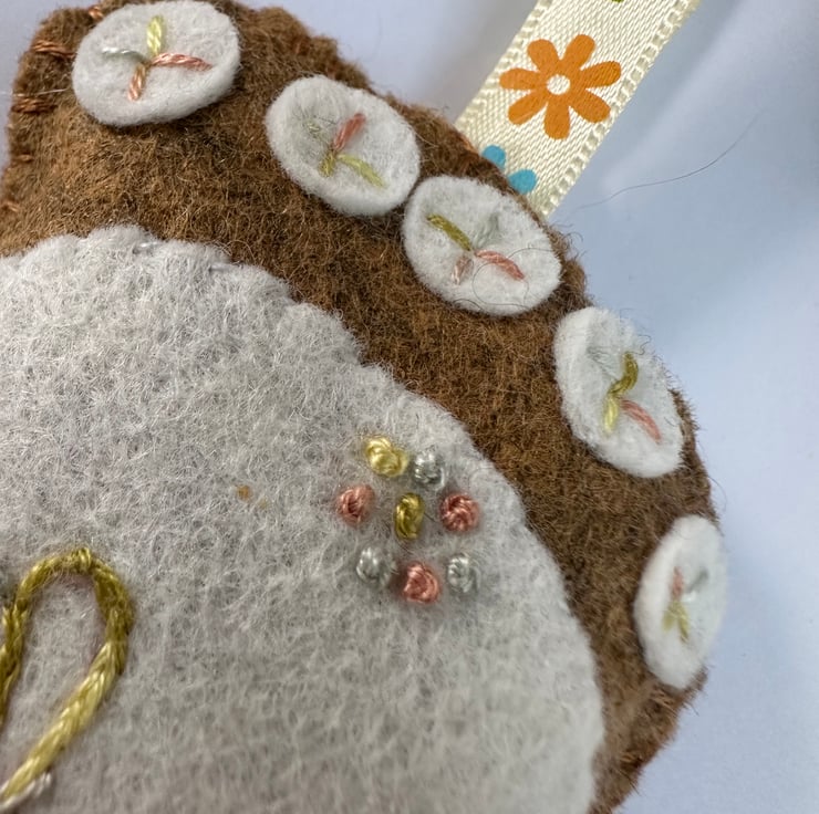 Made using the softest, quality, high (40%) wool content felt on the front and back, DMC cotton threads, glass seed beads with a pretty contrasting ribbon to hang it with.