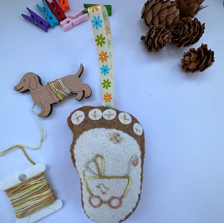 Hanging new baby footprint,first Christmas, hand embroidered, nursery bauble.