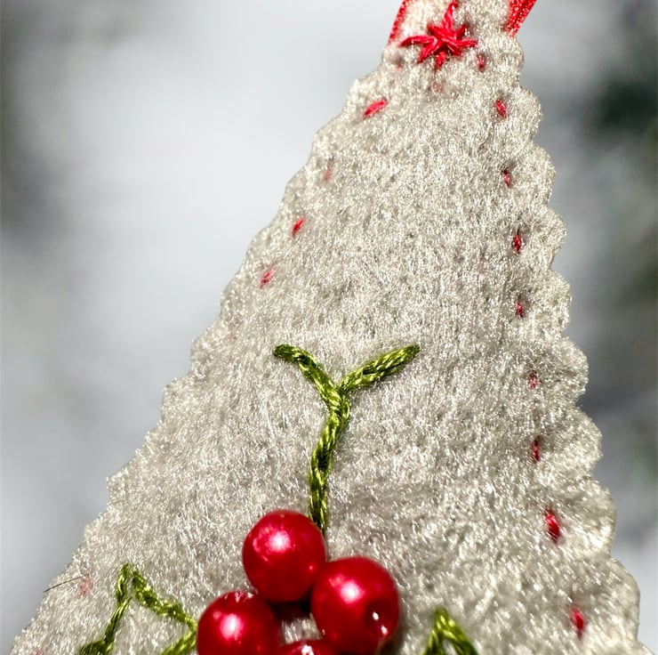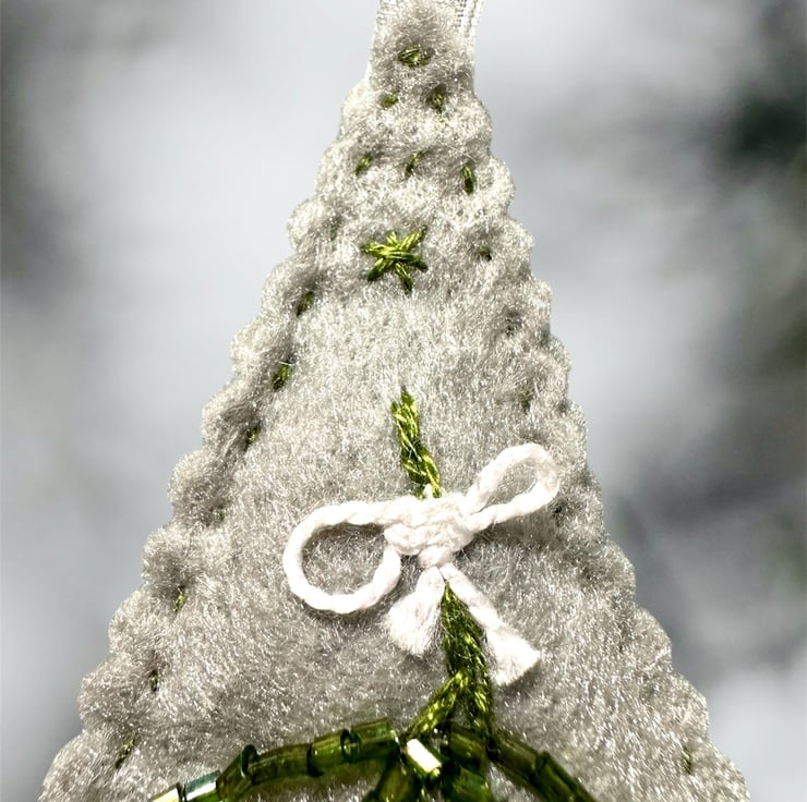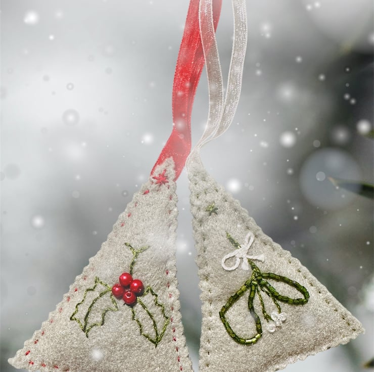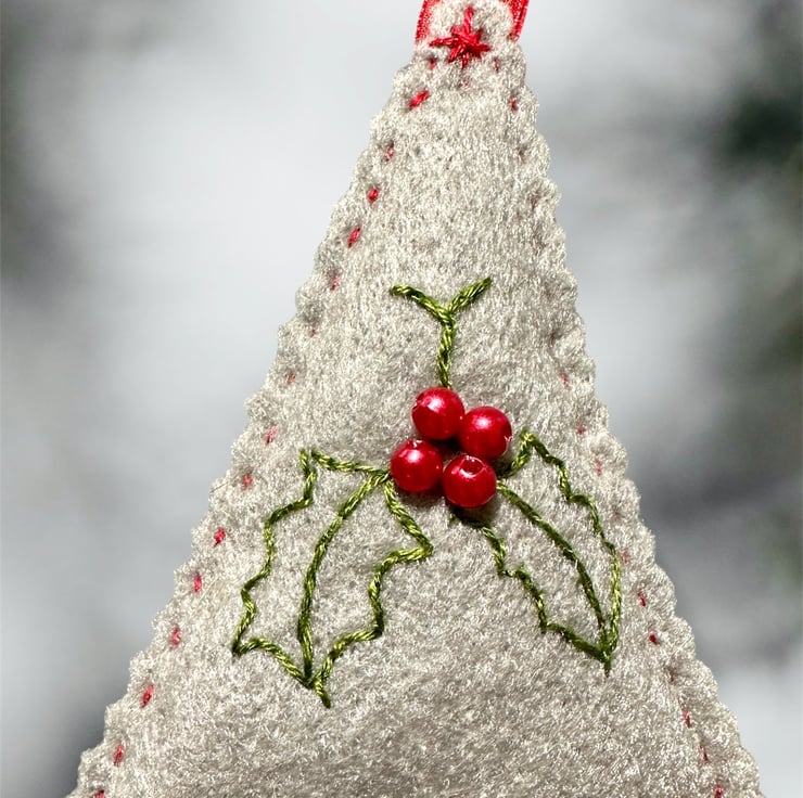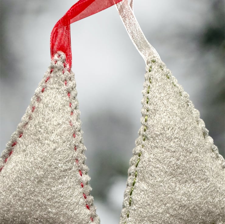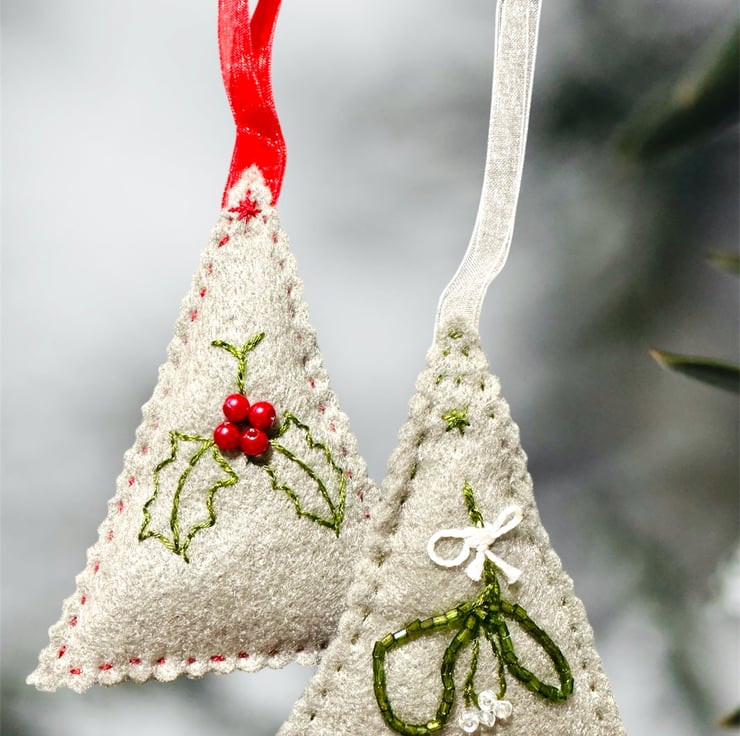 Hand cut and embroidered on a soft felt and with matching voile ribbons. Sewn with DMC Threads and decorated with tiny glass seed beads. Lightly padded with high loft CE polyester filling.