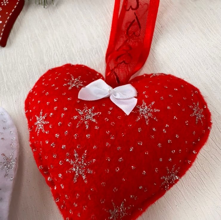 Set of 2 hand embroidered matching felt Christmas love hearts hanging ornaments