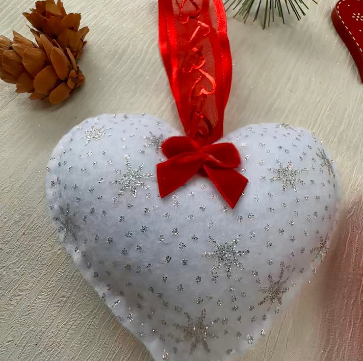 Hand cut and embroidered on a soft felt with silver glitter stars and with matching ribbons and bows. Lightly padded with high loft CE polyester filling.