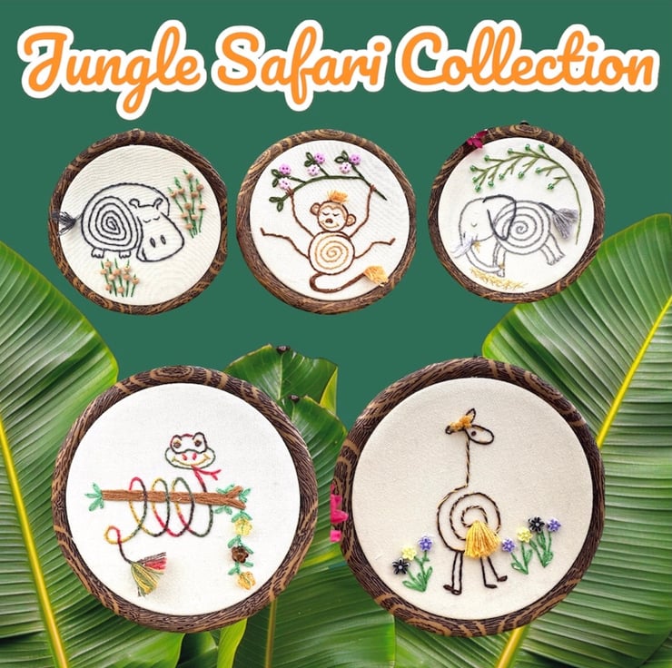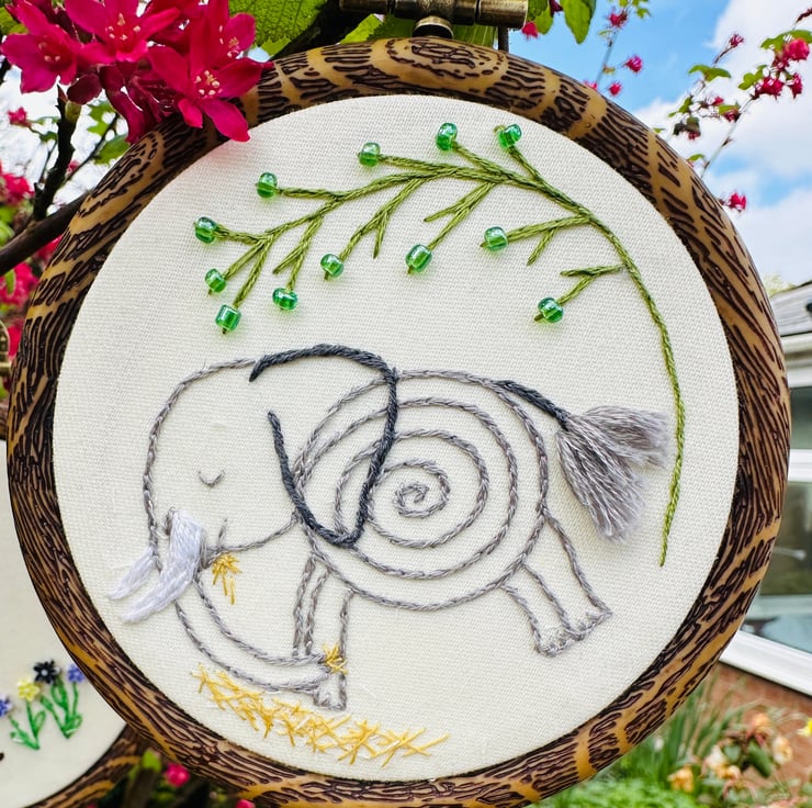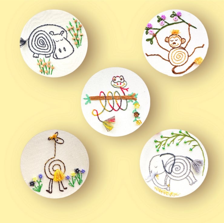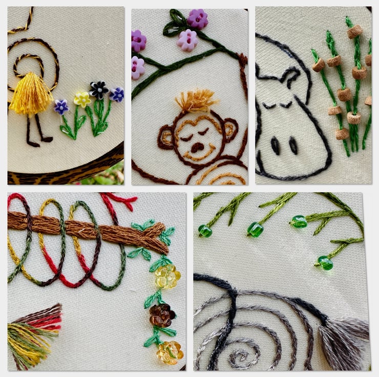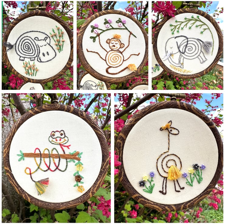 Each individual picture is done in a different colour range and with assorted stitches and embellishments for a unique effect.
