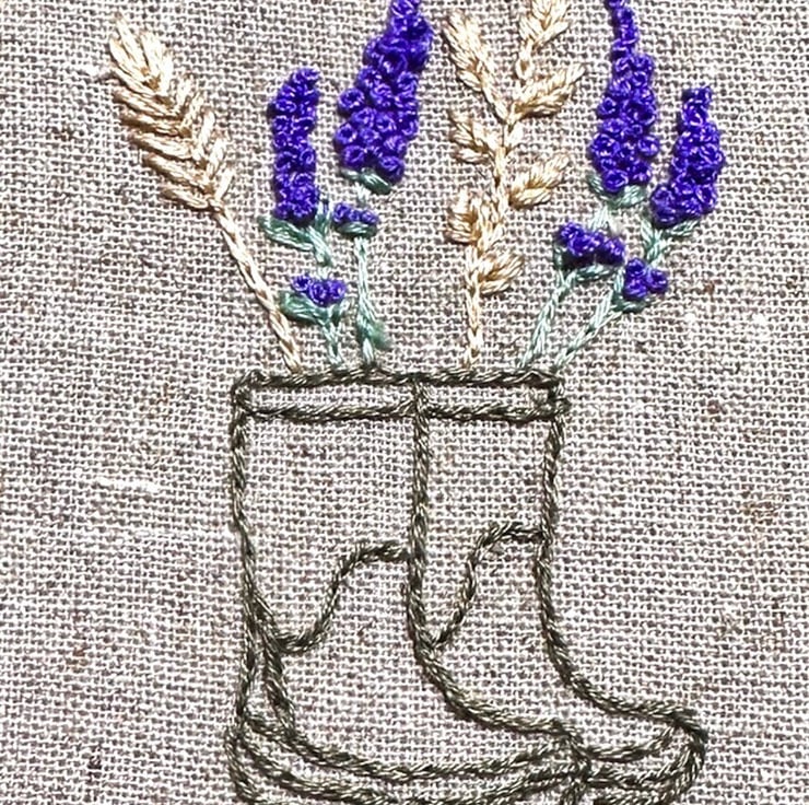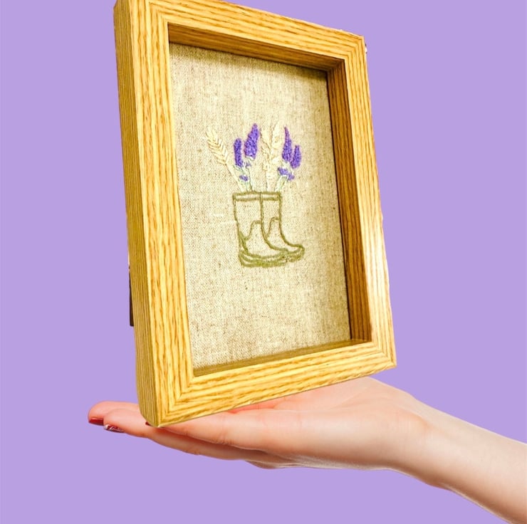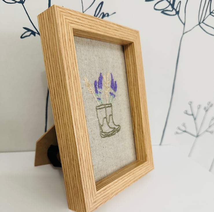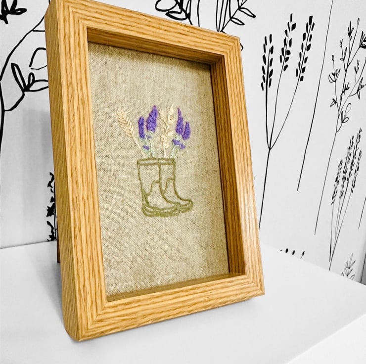 A natural country style image of wellies and florals hand embroidered on a raw cotton and mounted in a pine glass fronted deep set frame.