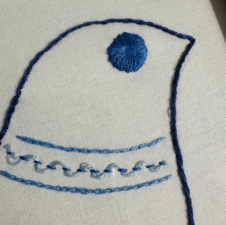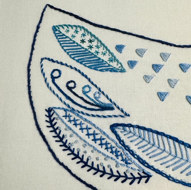Lovingly hand stitched with quality colourfast DMC cotton in assorted complementary blues. A host of various stitches for variety and texture.