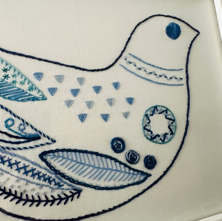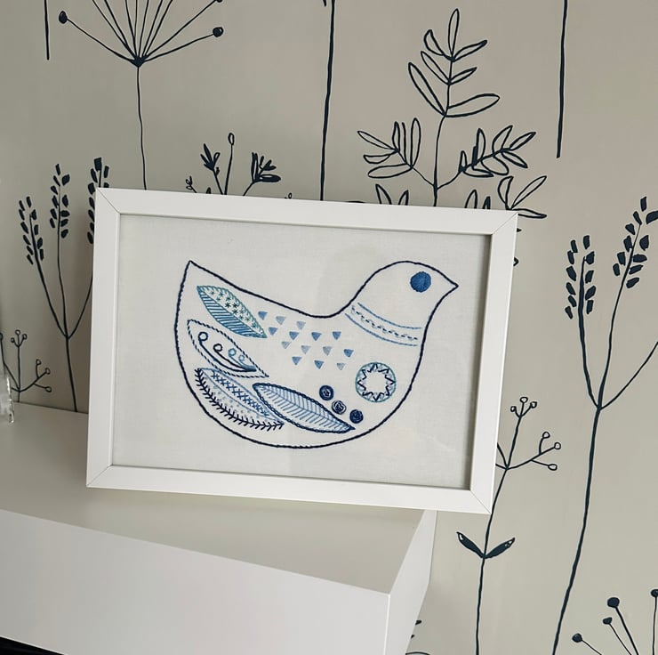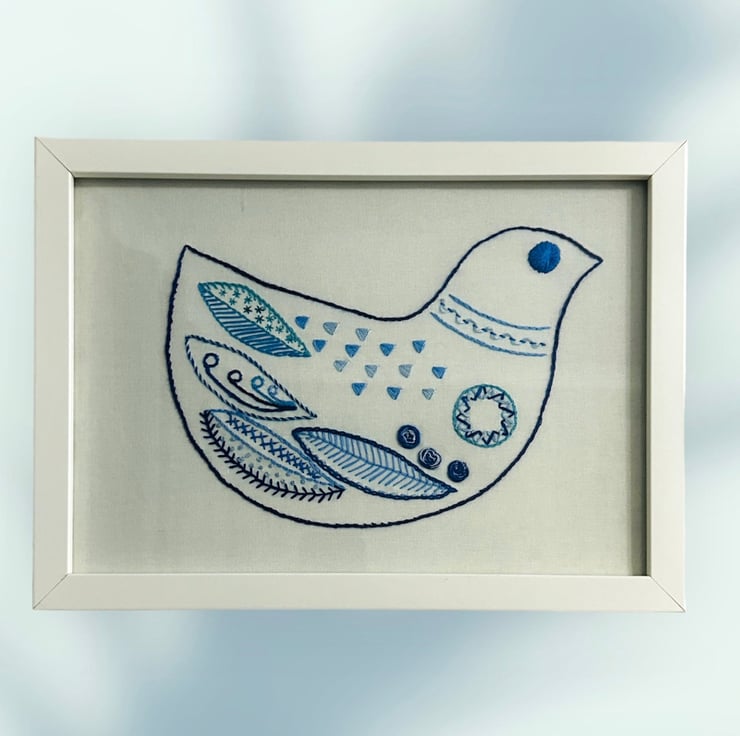 Hand embroidered picture, Scandi style Delph blues and white bird in white frame