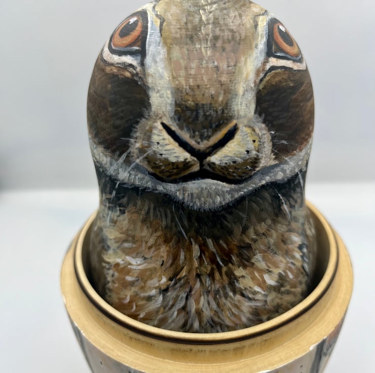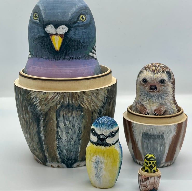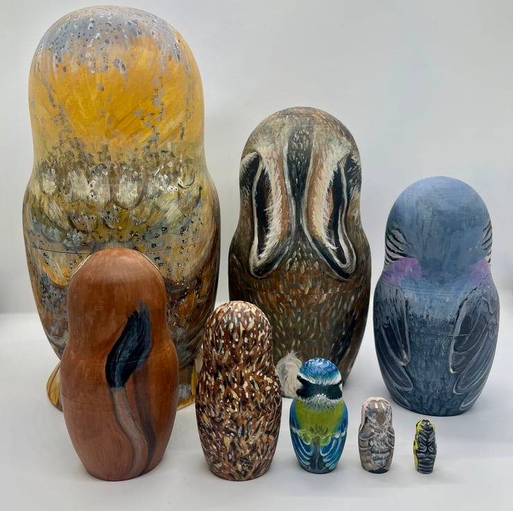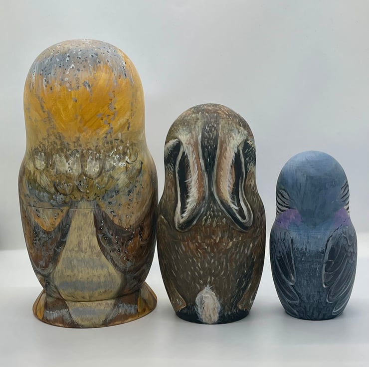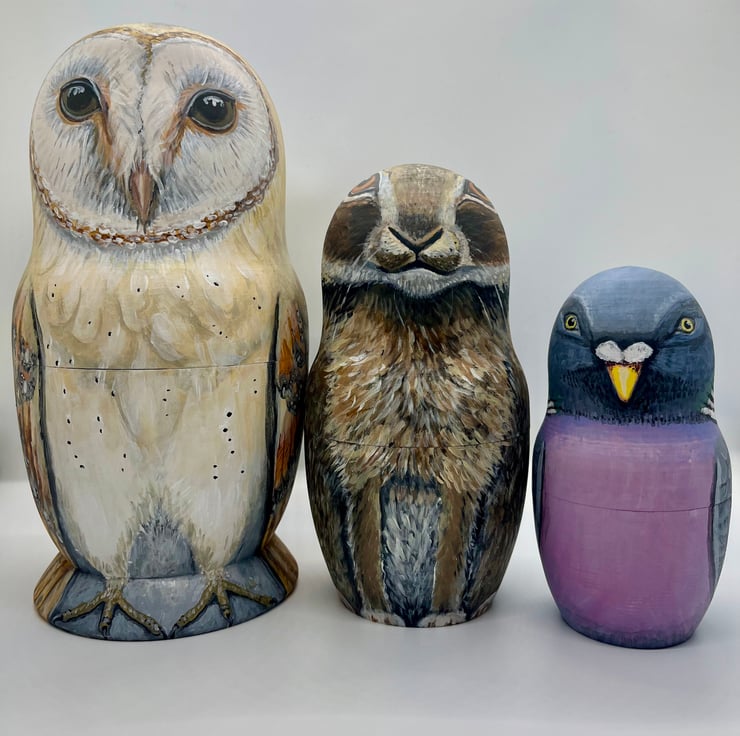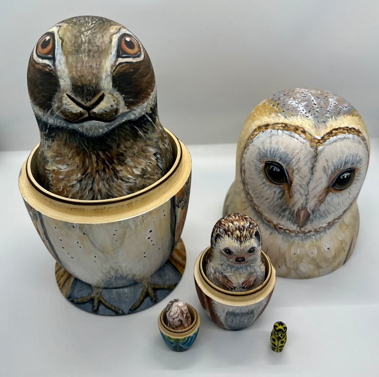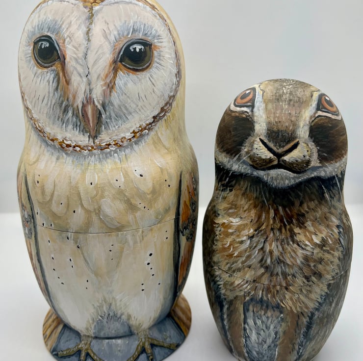 The animals fit inside each other, the largest, barn owl, measuring approximately 23cms tall.