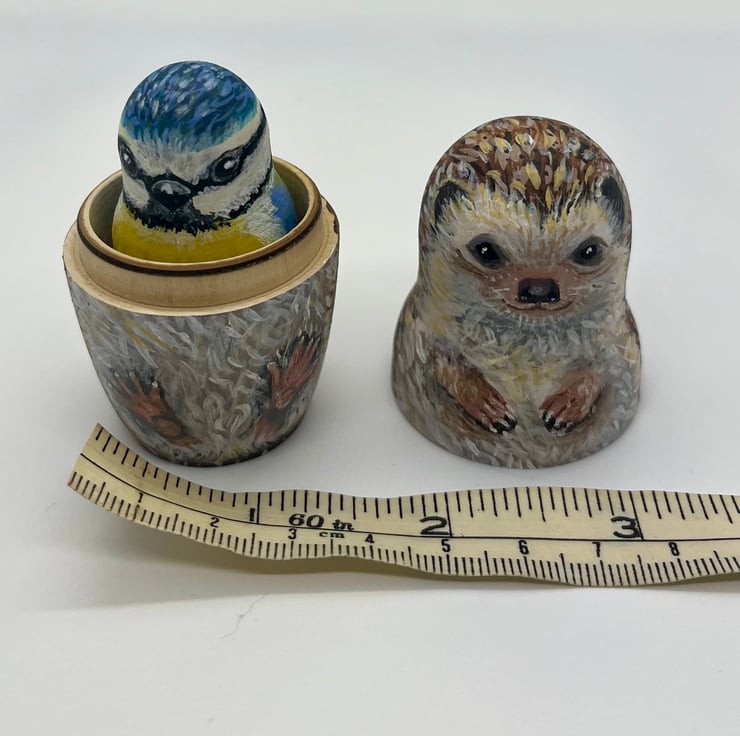 This intricately painted set features a barn owl, a moon-gazing hare, a wood pigeon, a stoat, a hedgehog, a blue tit, a shade moth and a yellow spot ladybird.