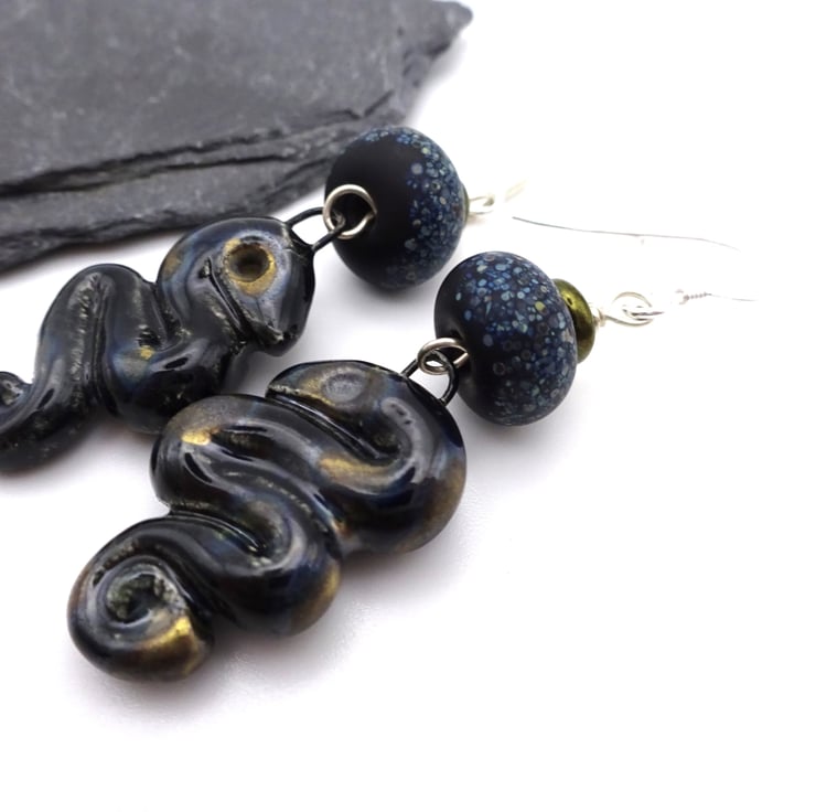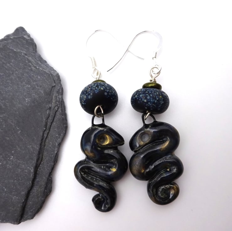 A pair of earrings made with sterling silver ear wires, handmade lampwork black glass beads and handmade ceramic serpent charms.