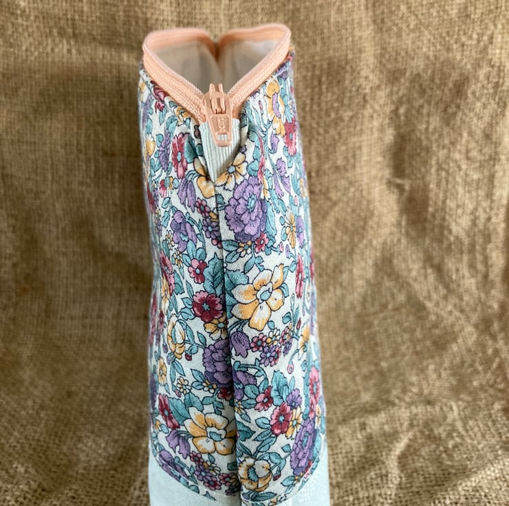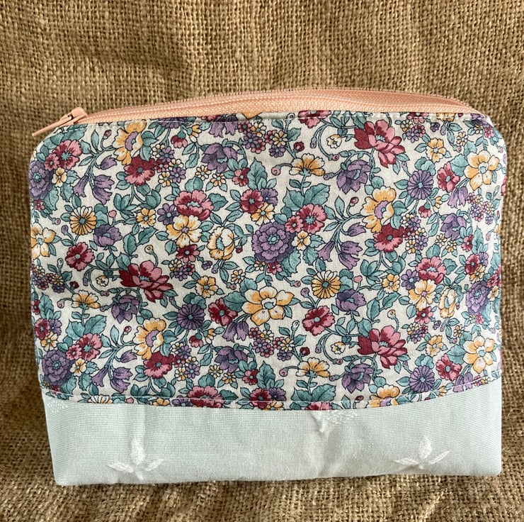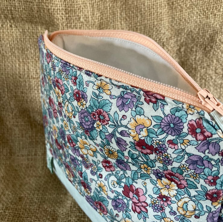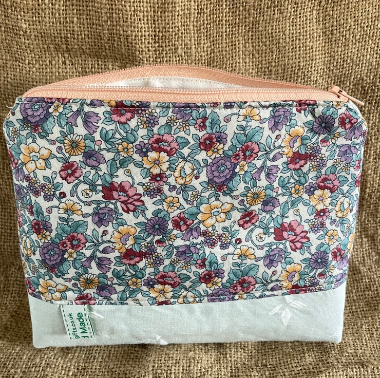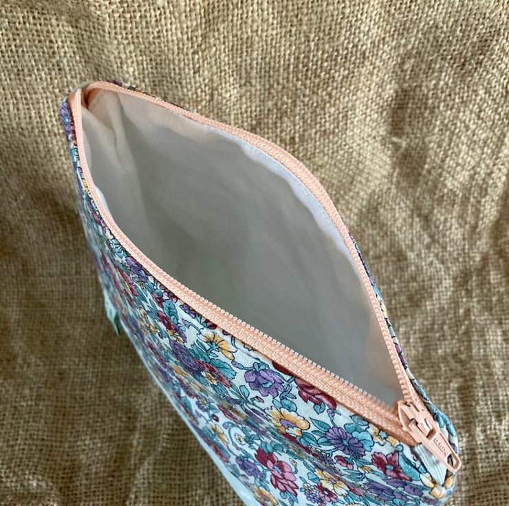 Cut from pretty Liberty lawn this is a neat sized pouch for those smaller cosmetic or make up items. It has a full width nylon zip and white lining. Fully interfaced. Wash on a cool setting.