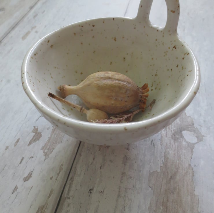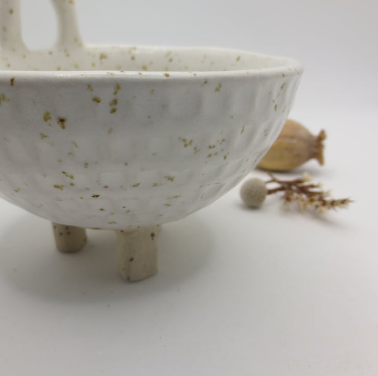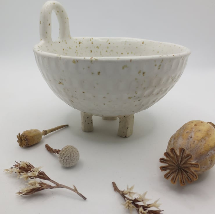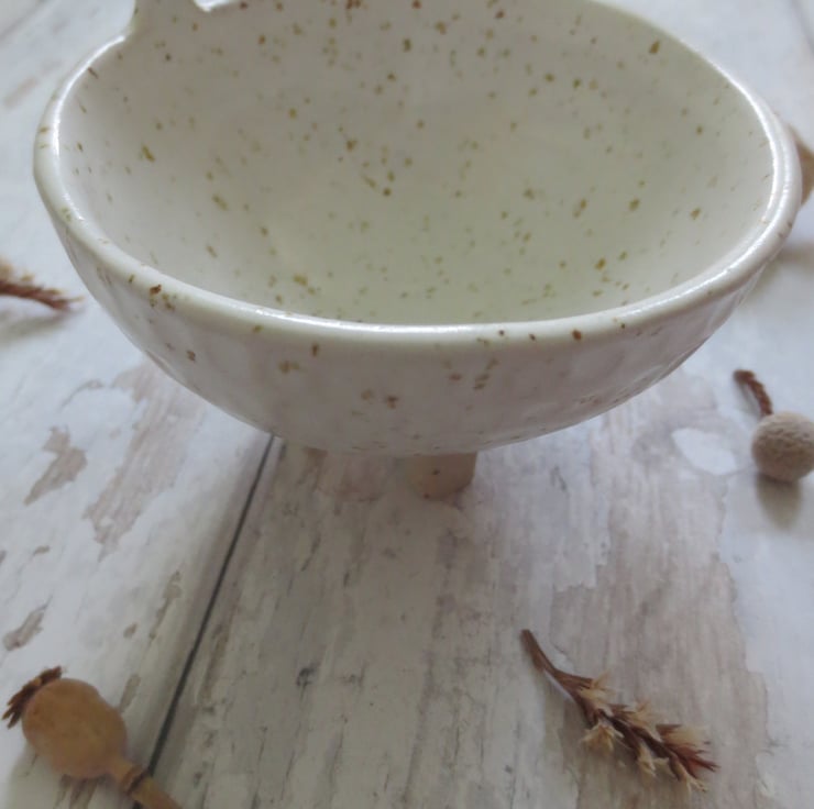 Beautiful tripod candle holder or trinket dish, hand built from speckled buff coloured clay, carved to give a rich texture.