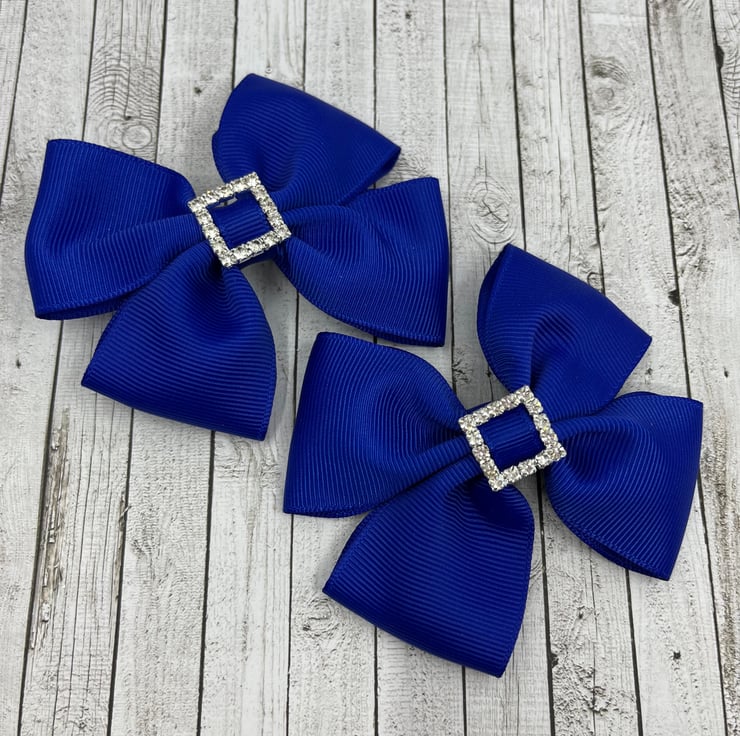 Cobalt Blue Classic Double Bows with Square Diamond Buckle on Clips (pair)