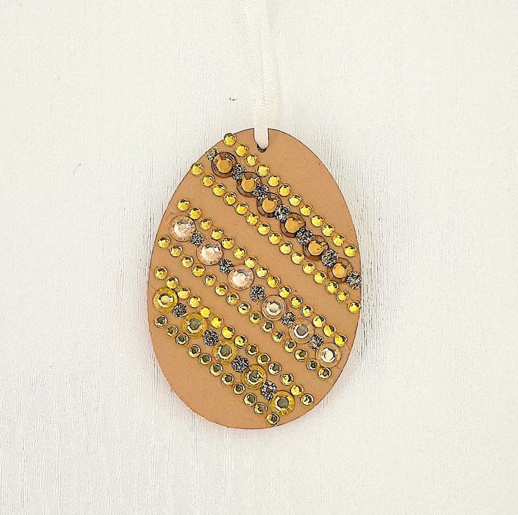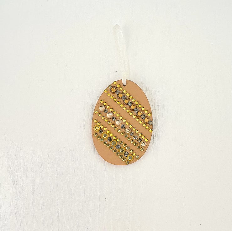 Easter egg hanging decoration - hand crafted. Size of egg 7cm by 5cm, plus additional length of cream slim satin ribbon. The wooden Easter egg shape has been rustically hand painted with several layers of terracotta/ apricot acrylic paint, then decorated with glitters and faux jewels, giving it a gorgeous sparkling appearance. The reverse of the egg is painted plain. Other co-ordinating pieces available. See shop for details or message for information. Lovely ornament to hang from a twig or a hook.