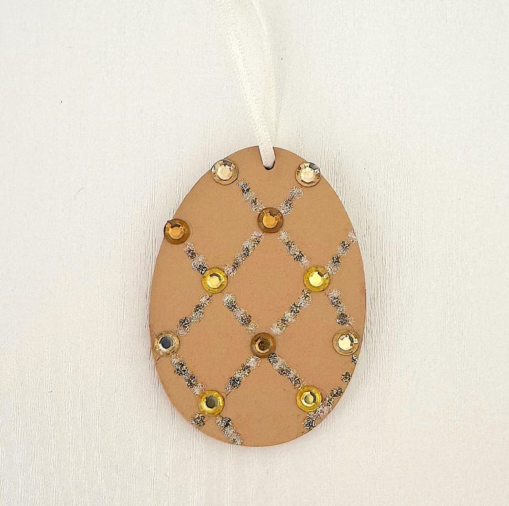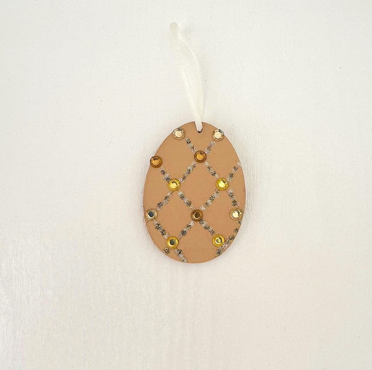 Easter egg hanging decoration - hand crafted. Size of egg 7cm by 5cm, plus additional length of cream slim satin ribbon. The wooden Easter egg shape has been rustically hand painted with several layers of terracotta/ apricot acrylic paint, then decorated with glitters and faux jewels, giving it a gorgeous sparkling appearance. The reverse of the egg is painted plain. Other co-ordinating pieces available. See shop for details or message for information. Lovely ornament to hang from a twig or a hook.