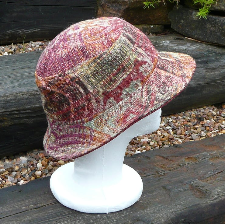 This hat is part of my winter 2024 new range, its a wool tweed pull on bucket hat in the tradiotional style with lots of top stitch detail, it is fully lined in marron poly cotton and the underside of the brim is a a complimenting wool tweed in maroon and gold check.