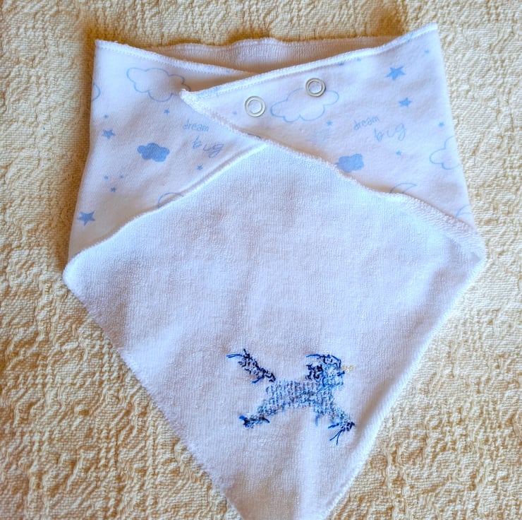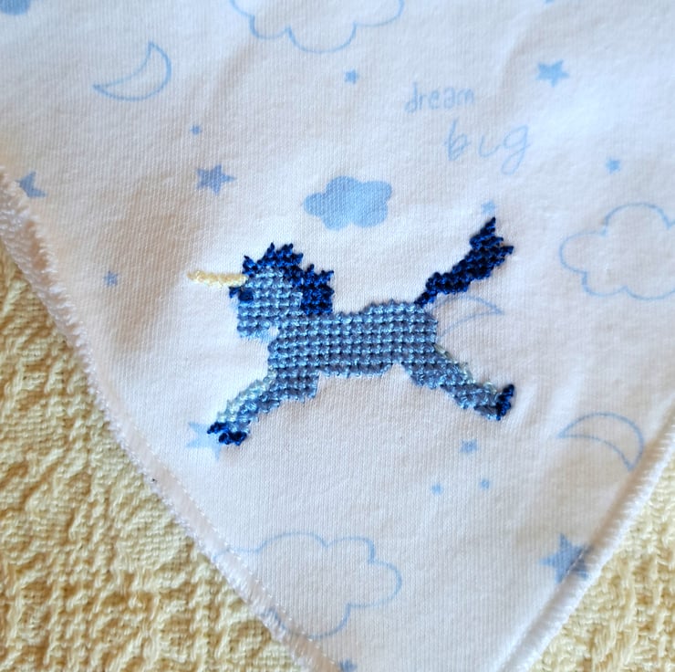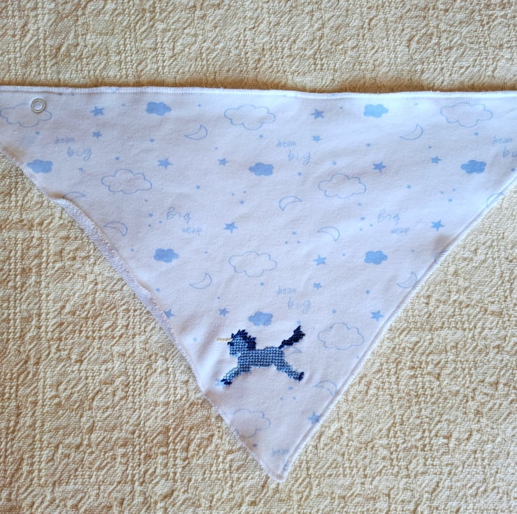 I have hand stitched a light blue unicorn with a sparkly ivory horn and dark blue mane, tail and hooves on the bottom corner of this bib. The bib is white with pale blue and white clouds, stars and crescent moons printed on it, along with the words 'dream big' in small light blue letters. The front of the bib is cotton jersey and the back cotton/polyester towelling. It fastens with adjustable press studs at the back of the neck and is machine washable.