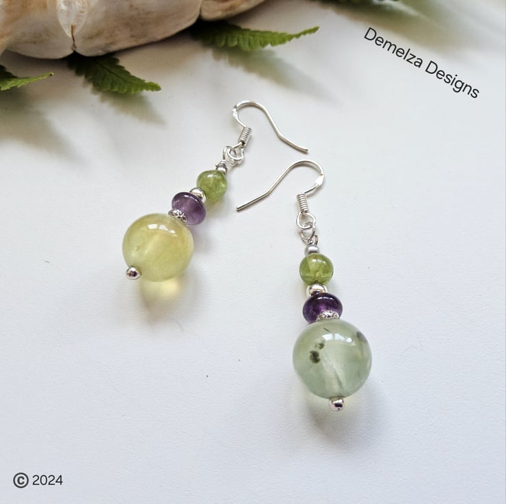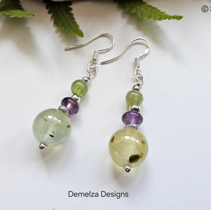 A lovely feminine pair of earrings designed and hand crafted in Cornwall using 8mm prehnite smooth polished round gemstones, 5mm smooth polished amethyst rondelles and 4mm smooth polished peridot round gemstones. Genuine gemstones are natural and everyone has it's own characteristics.
