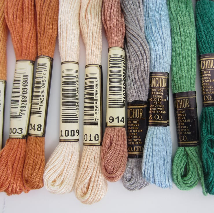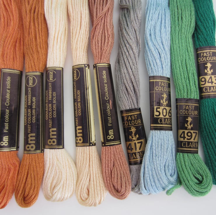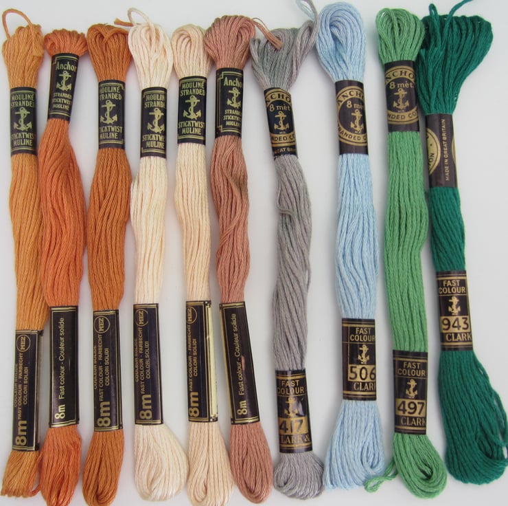 Selection of 10 skeins of Anchor embroidery threads in assorted colours of green, blue, cream, rust brown etc.