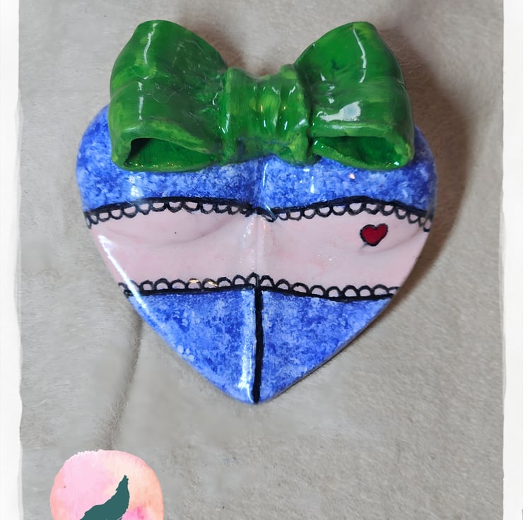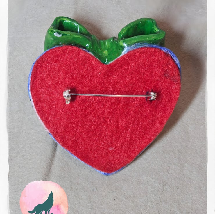 Heart-shaped & funky body positive booty brooch, fully handmade from polymer clay, hand painted, metal pin backed with wool blended felt & glazed with resin.