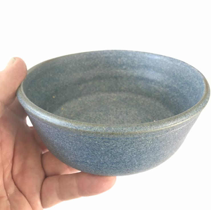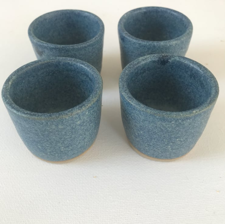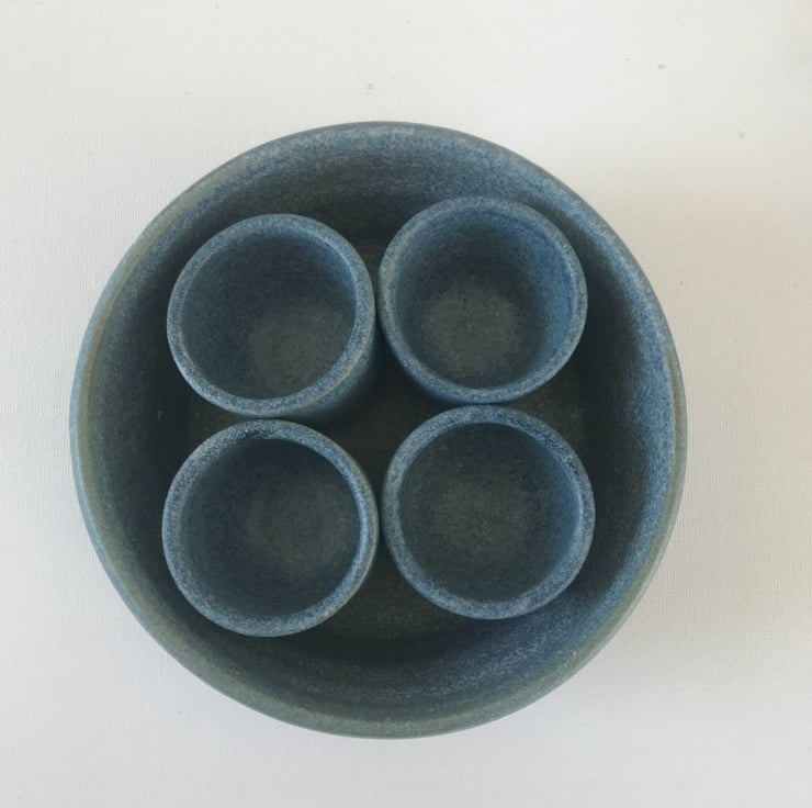 A set of four stoneware ceramic shot glasses and a nibbles bowl. All hand thrown on my potters wheel. Finished in a denim blue colour glaze.