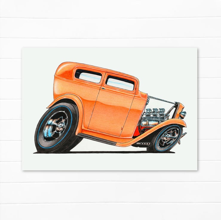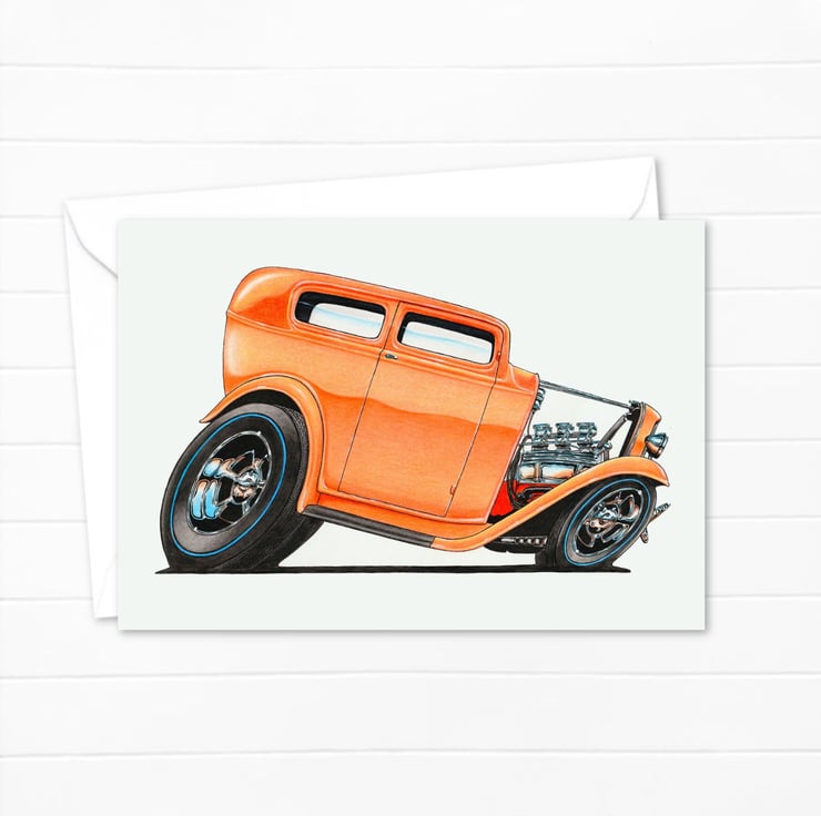 An original art greeting card featuring a hand-drawn pencil illustration of a classic American custom car. The artwork has been inspired by a love of 1950s and 1960s classic American cars.